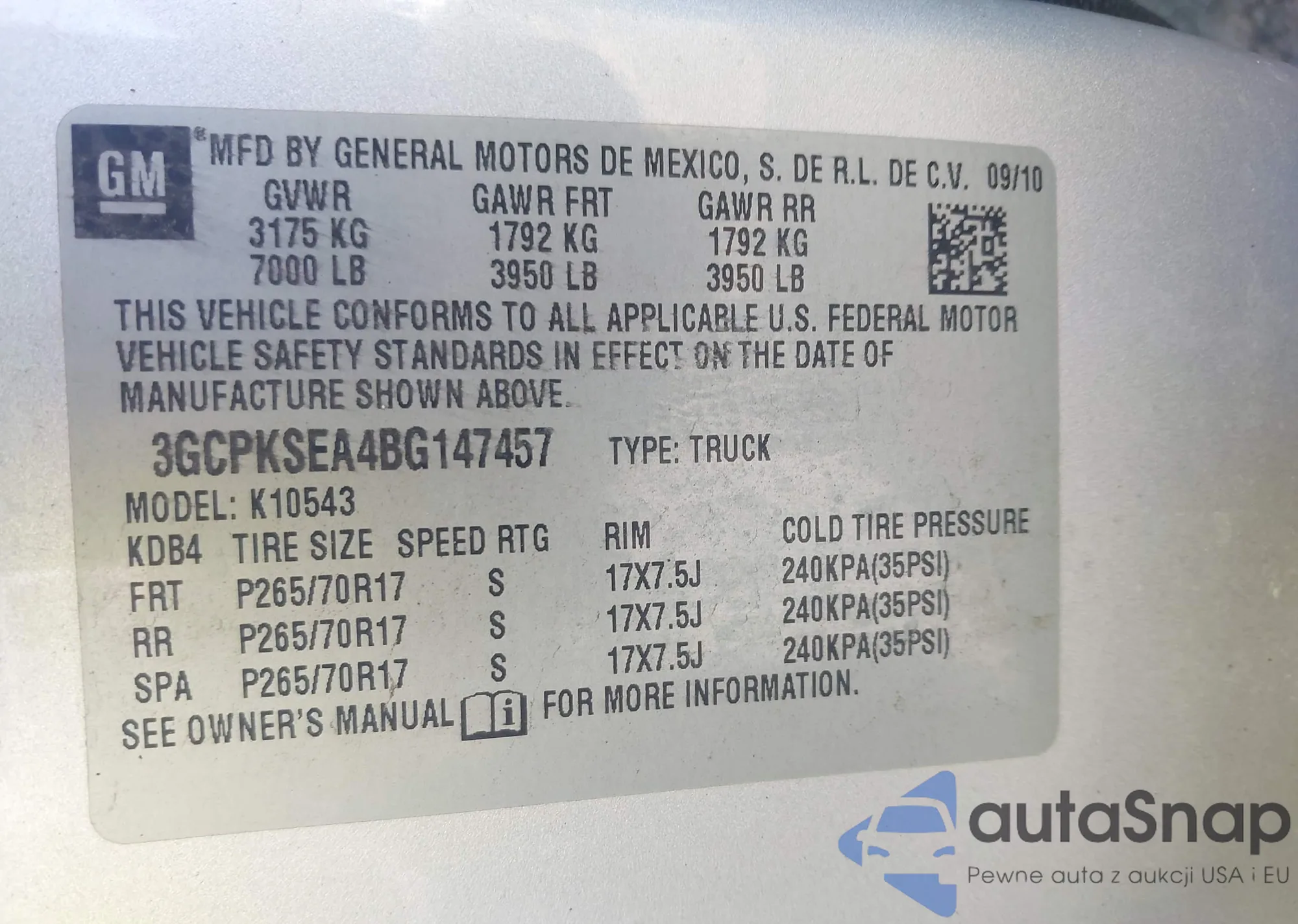 • VIN 3GCPKSEA4BG147457