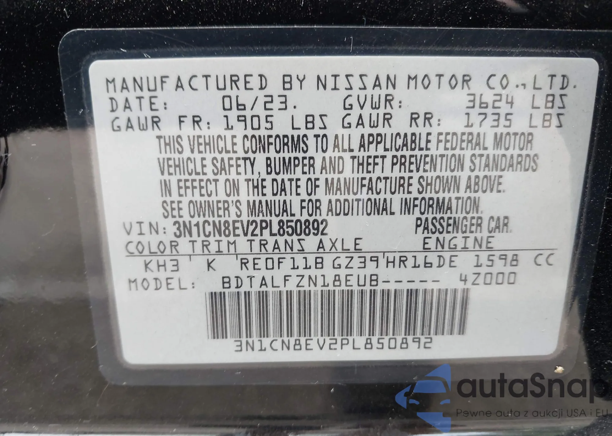 • VIN 3N1CN8EV2PL850892