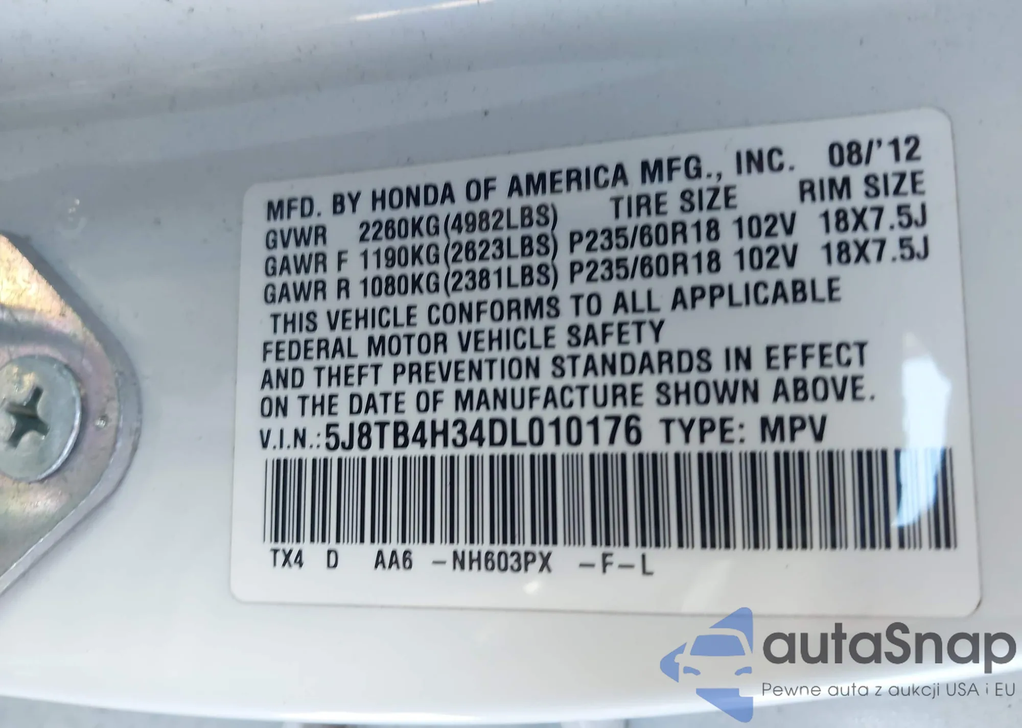 • VIN 5J8TB4H34DL010176