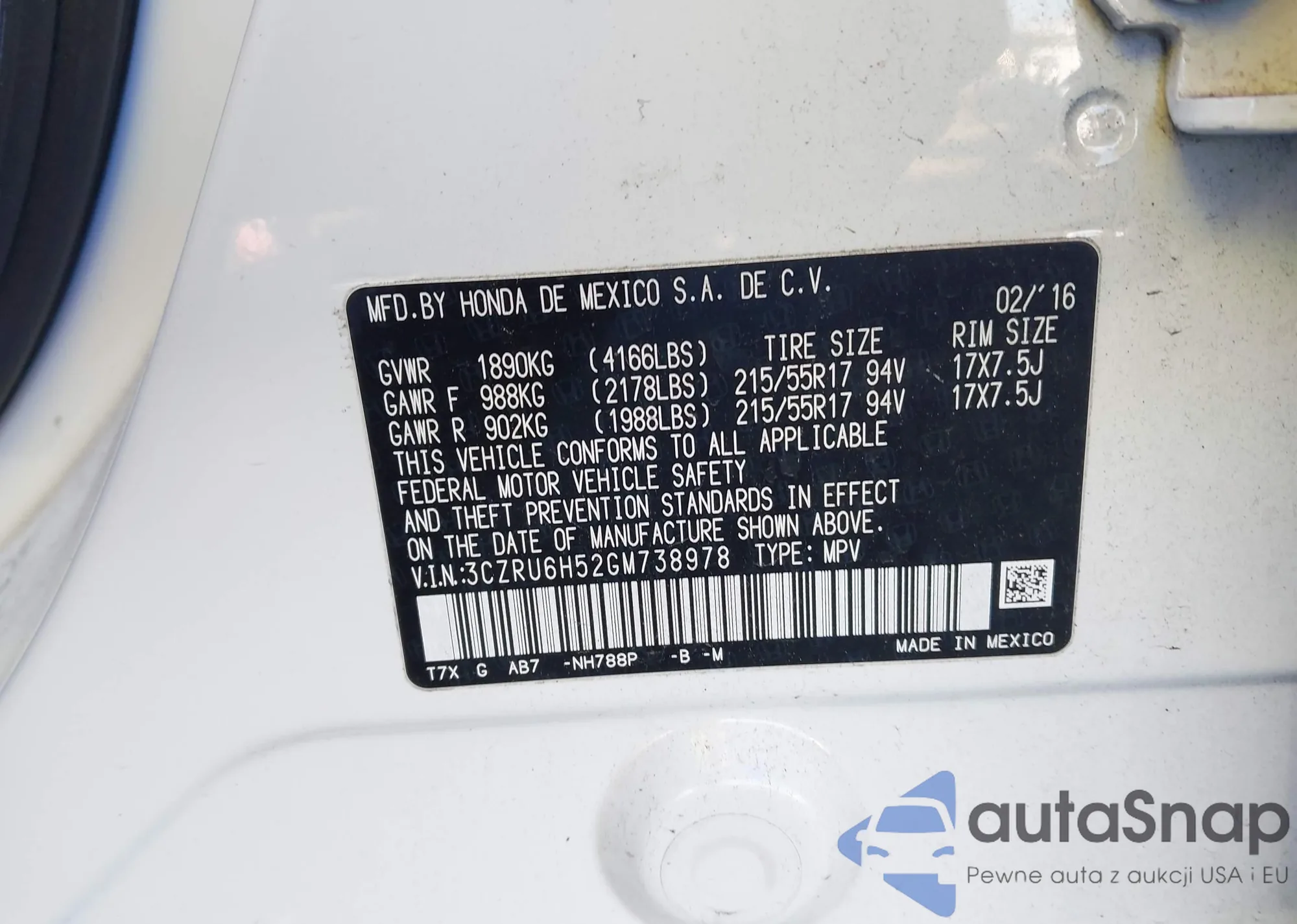• VIN 3CZRU6H52GM738978