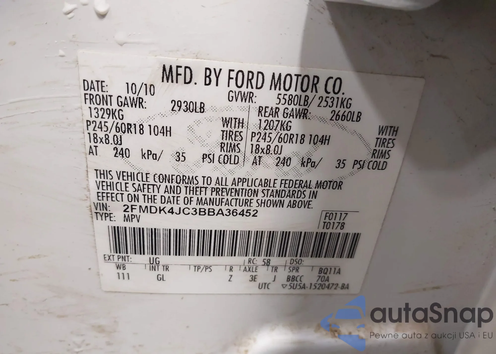 LOT: 43716410 VIN: 2FMDK3JC4ABA27137