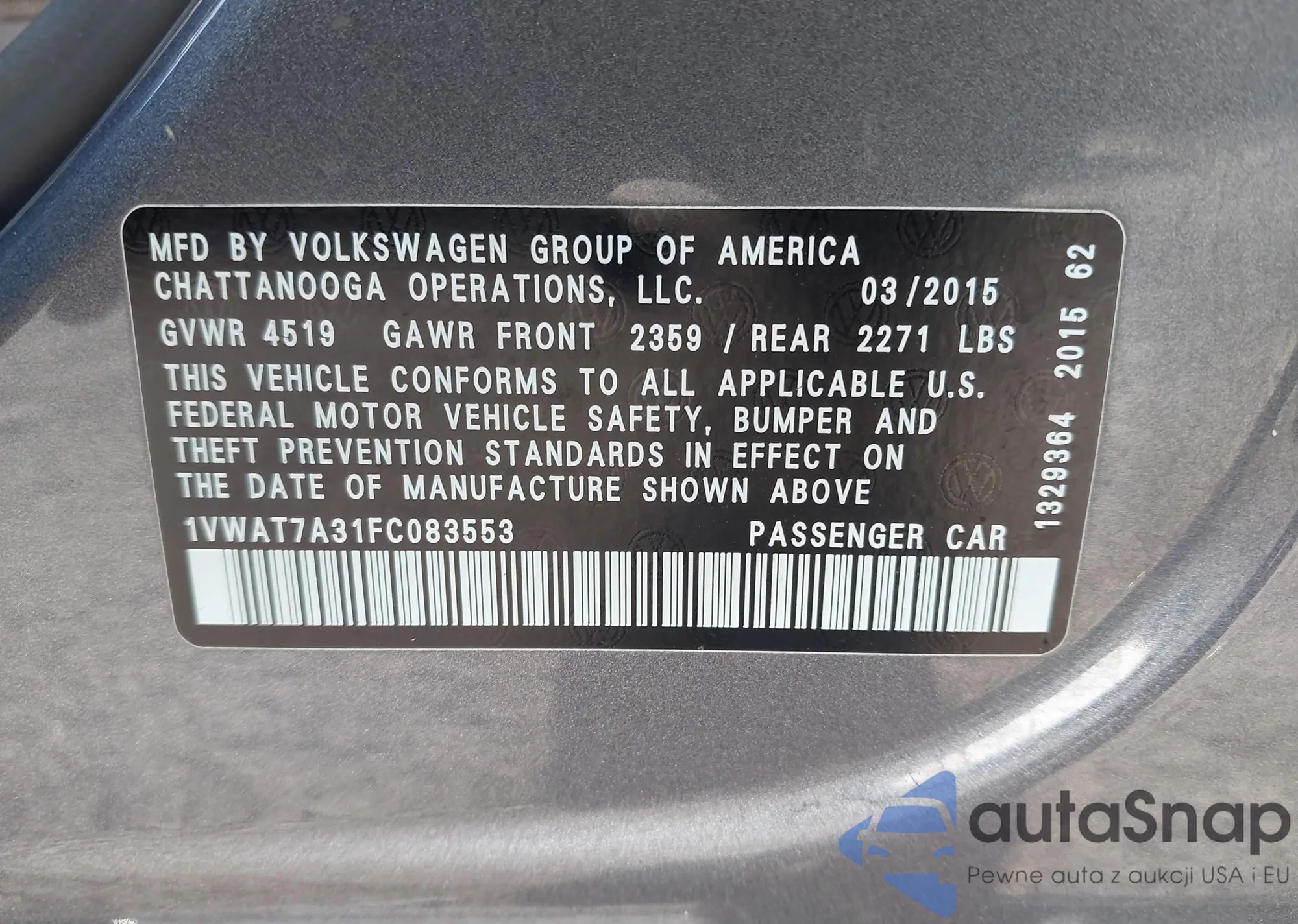 LOT: 42918585 VIN: 1VWAT7A31FC083553
