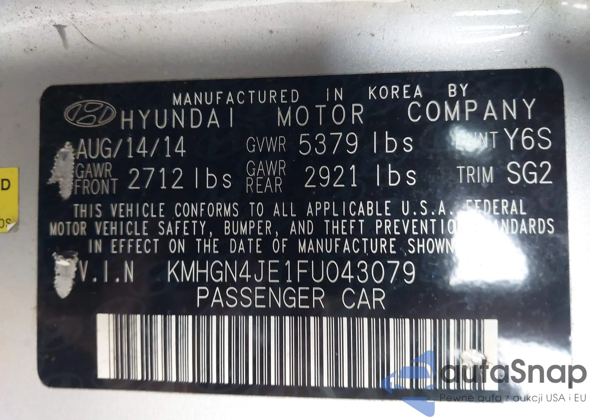 LOT: 43623741 VIN: KMHGN4JE1FU043079