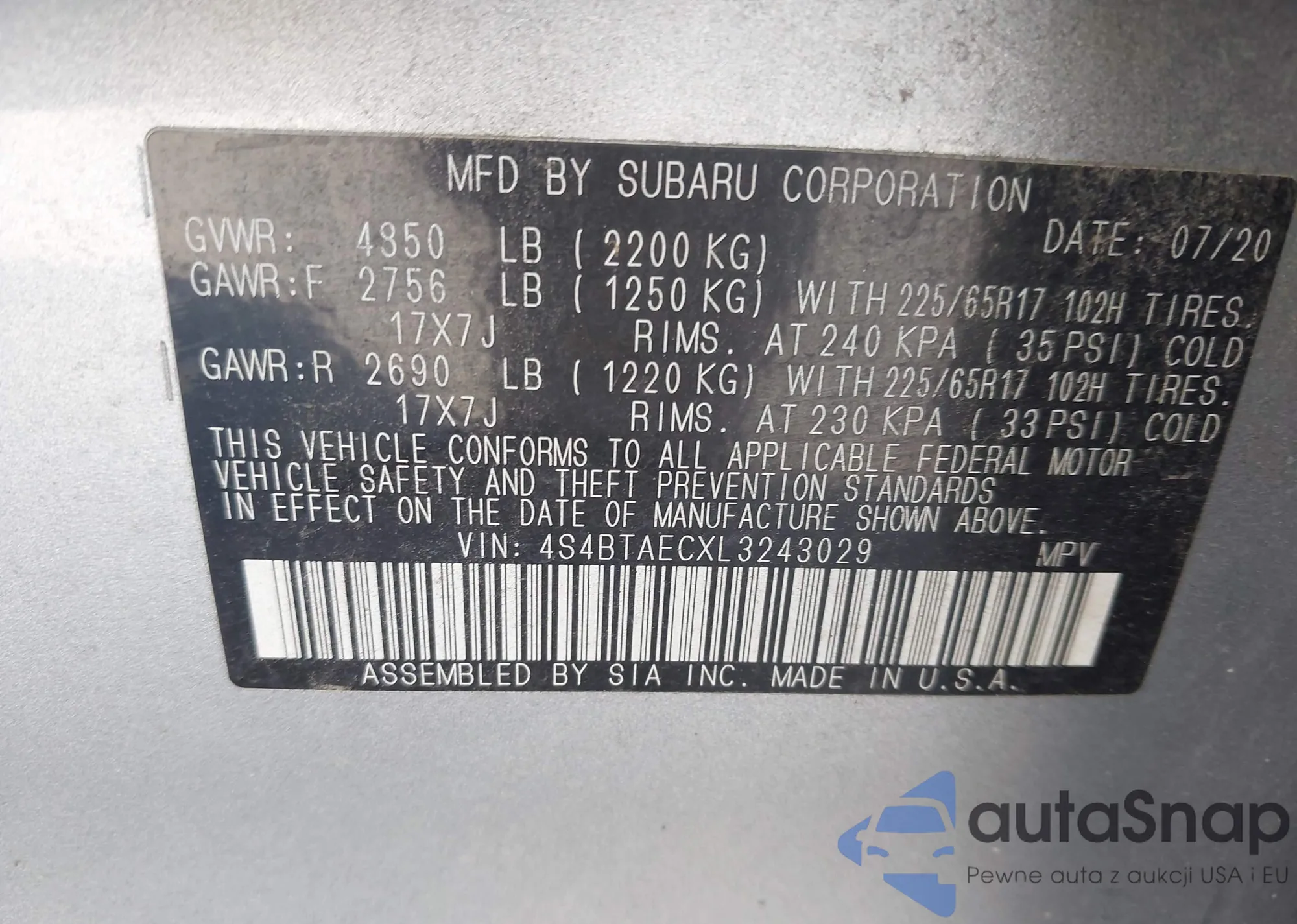 LOT: 43350488 VIN: 4S4BTAECXL3243029