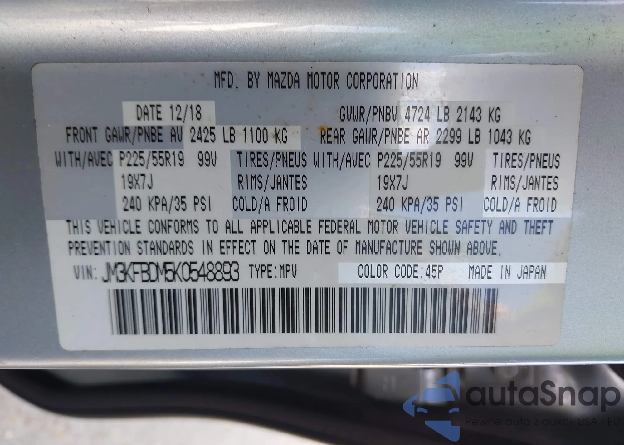 LOT: 43360874 VIN: JM3KFBDM5K0548893