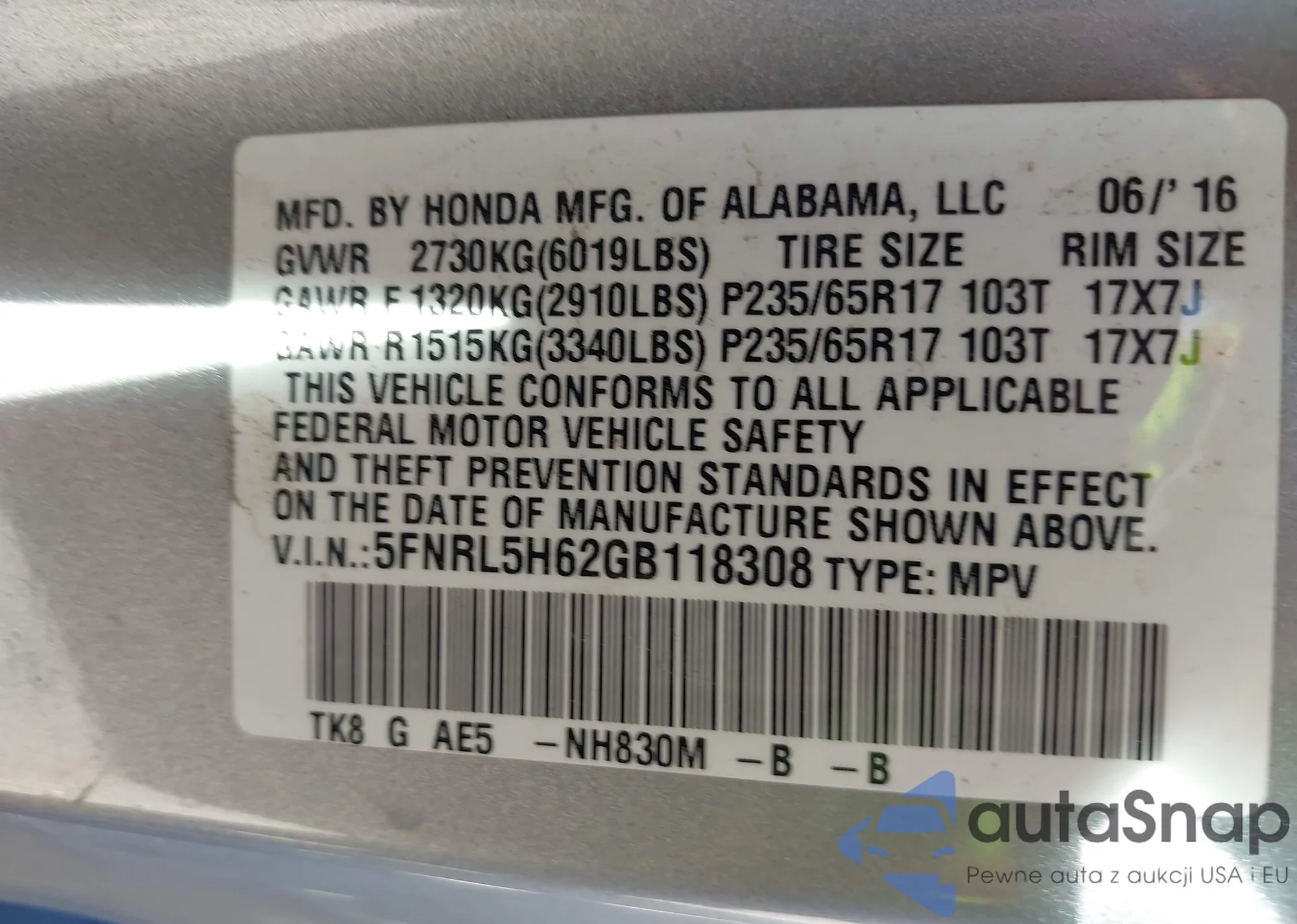 • VIN 5FNRL5H62GB118308
