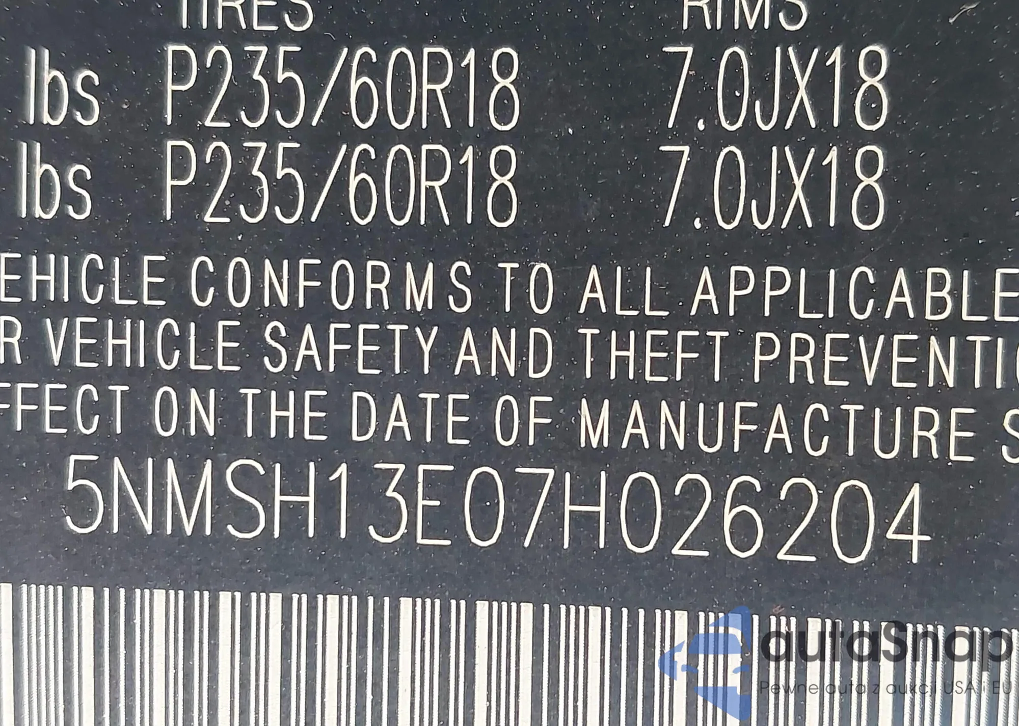 • VIN 5NMSH13E07H026204