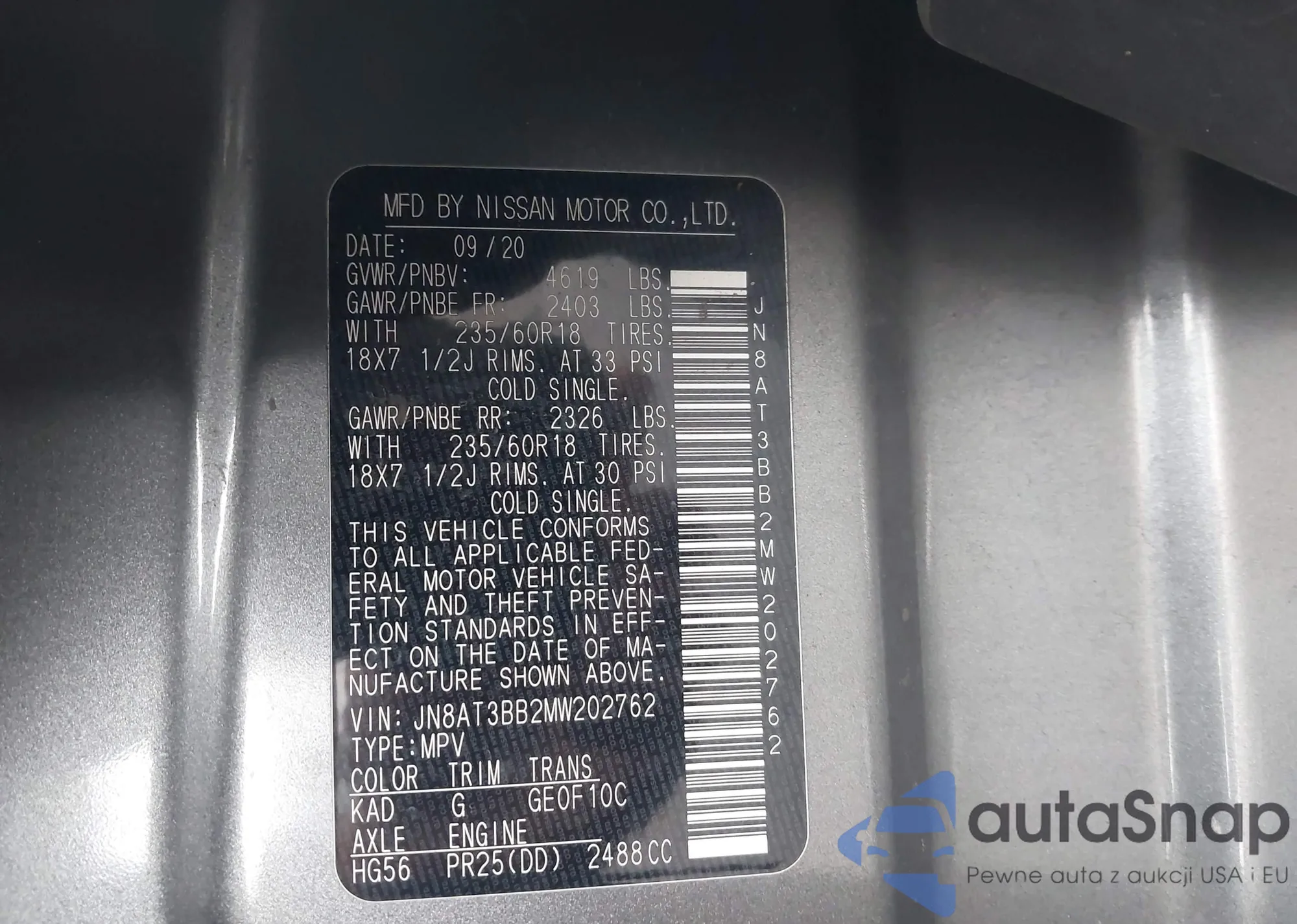 LOT: 43664775 VIN: JN8AT3BB2MW202762