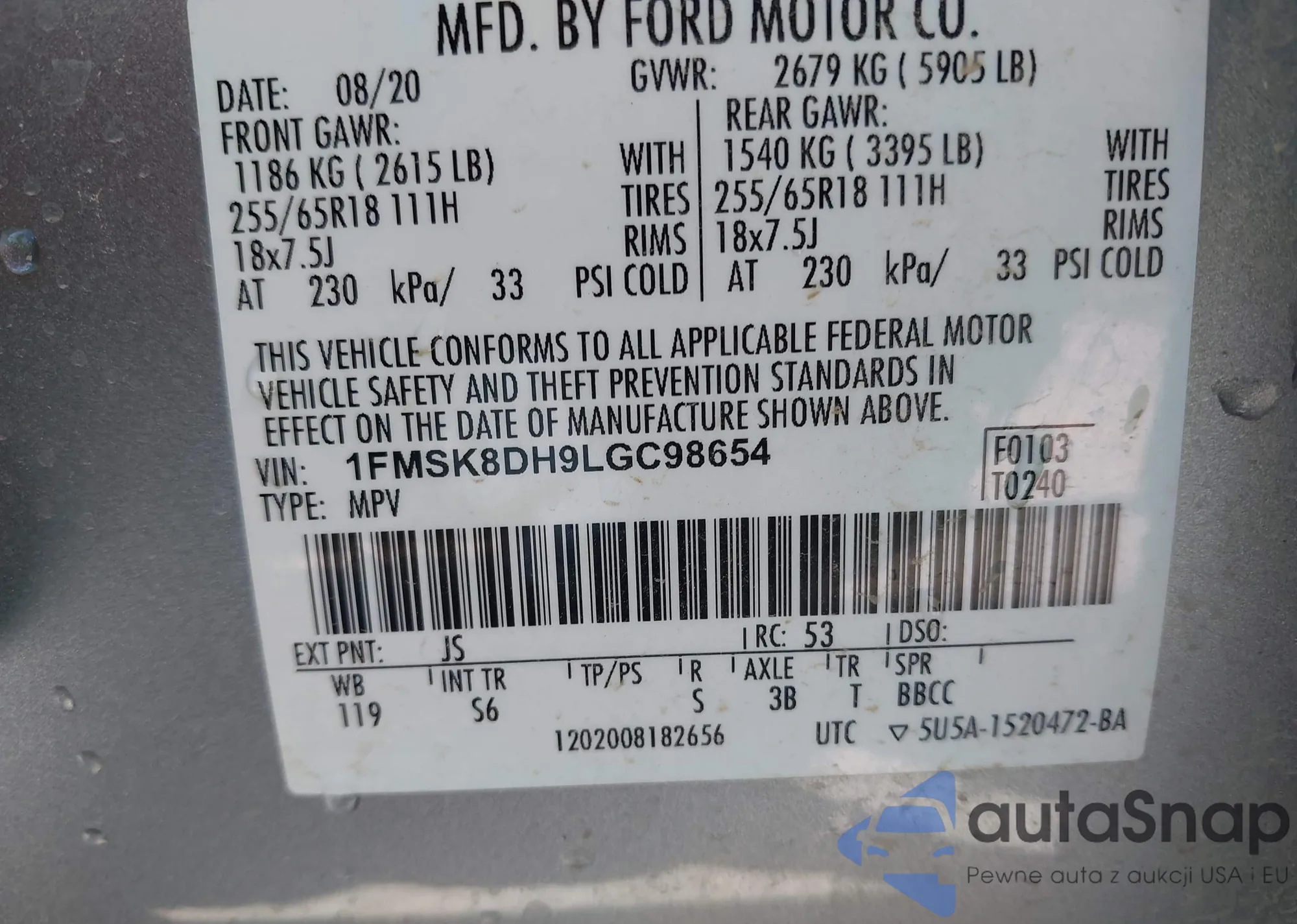LOT: 43262411 VIN: 1FMSK8DH9LGC98654