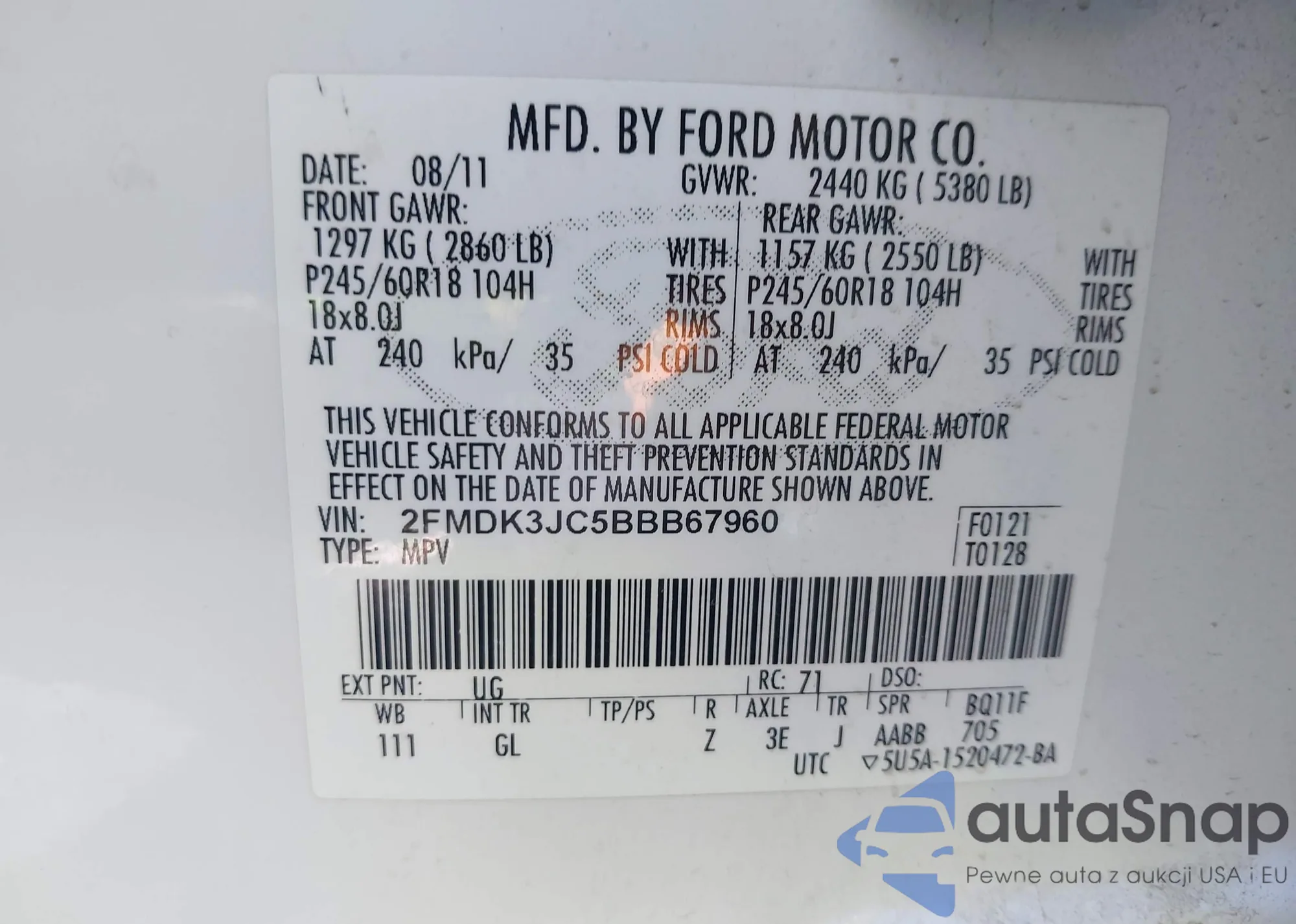 LOT: 43601978 VIN: 1ZVBP8EM0B5102786