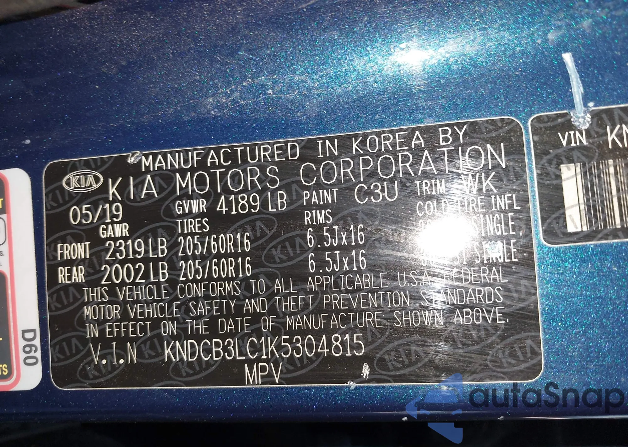• VIN KNDCB3LC1K5304815