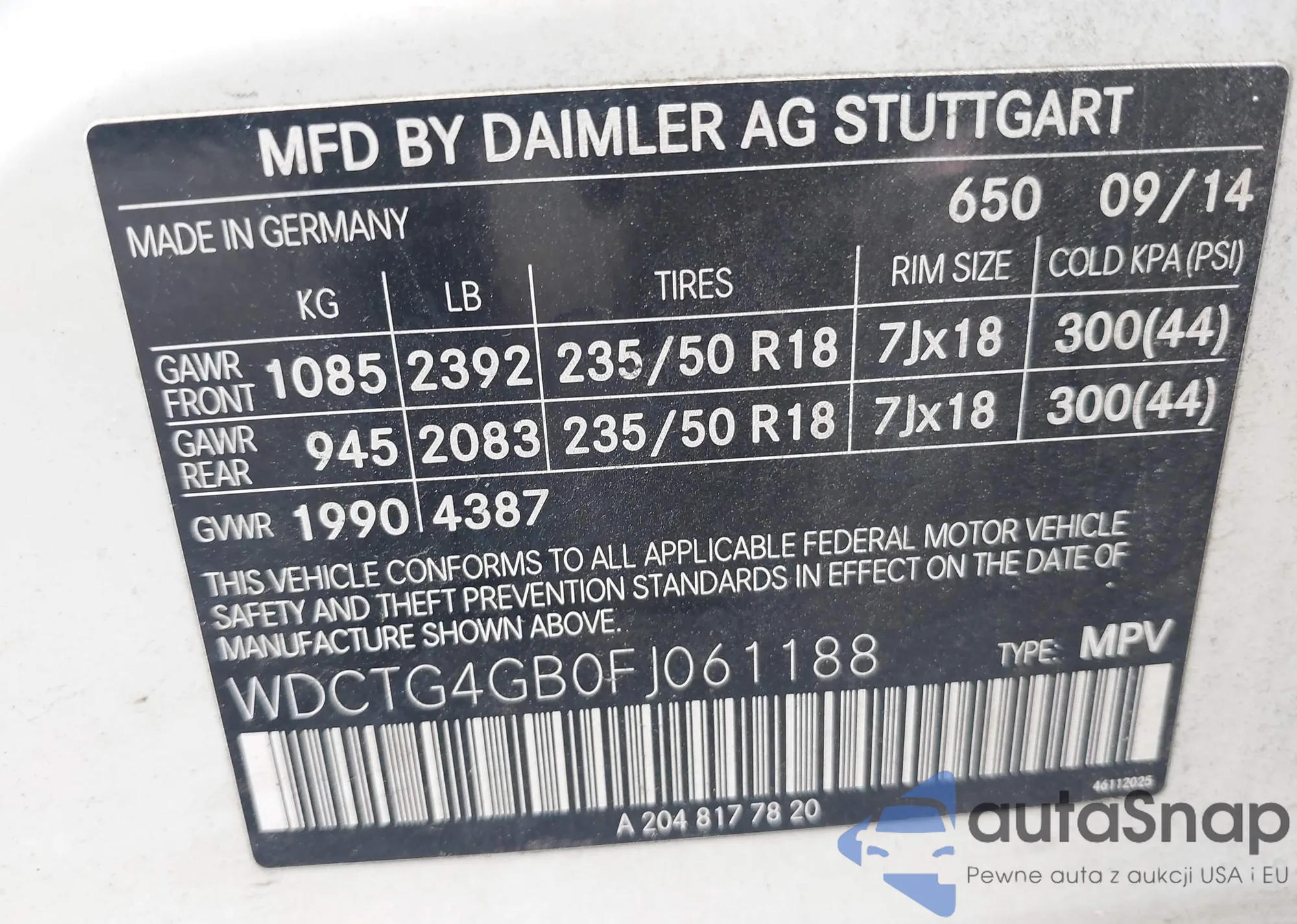 LOT: 43382360 VIN: WDCTG4GB0FJ061188