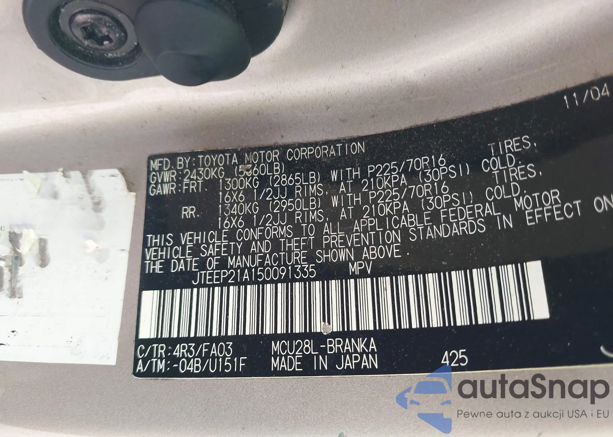 LOT: 43649810 VIN: JTEEP21A150091335