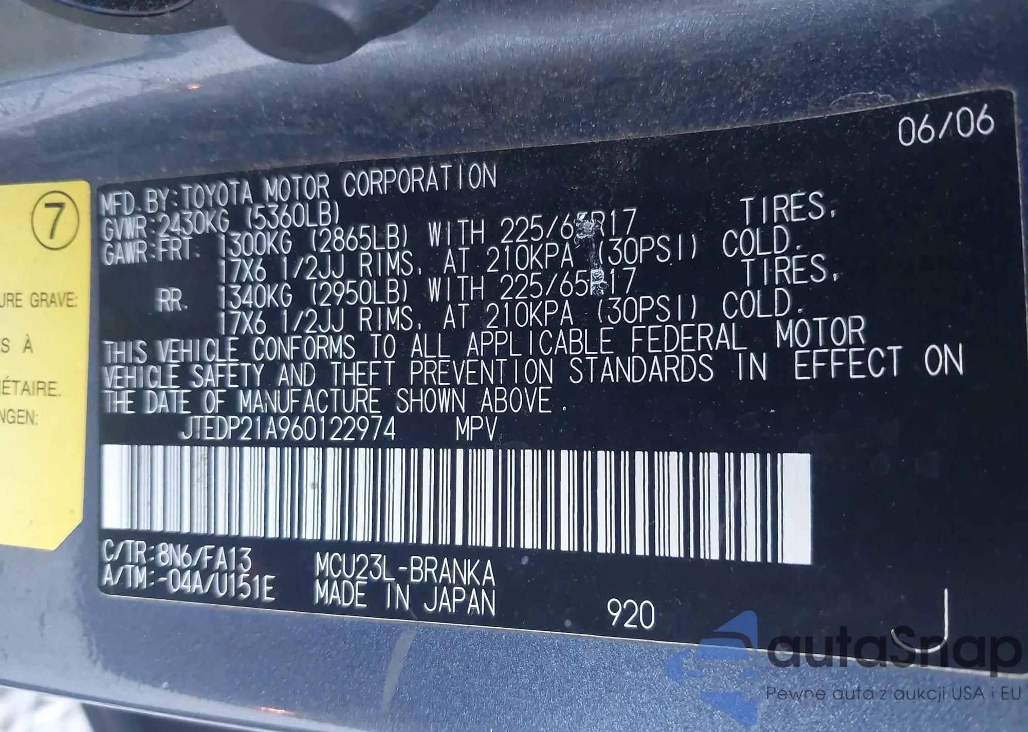 LOT: 43720363 VIN: JTEDP21A960122974