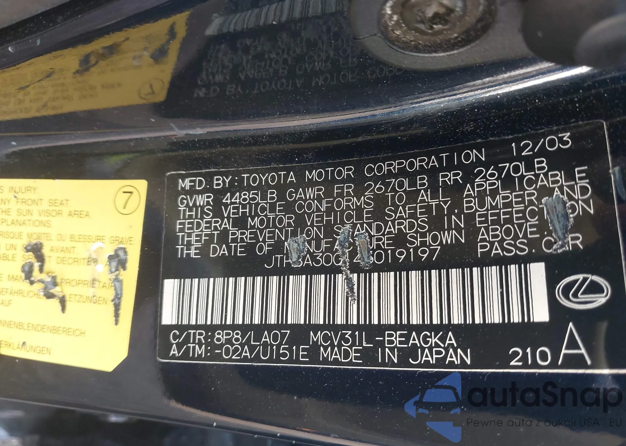 LOT: 43804942 VIN: JTHBA30G145019197