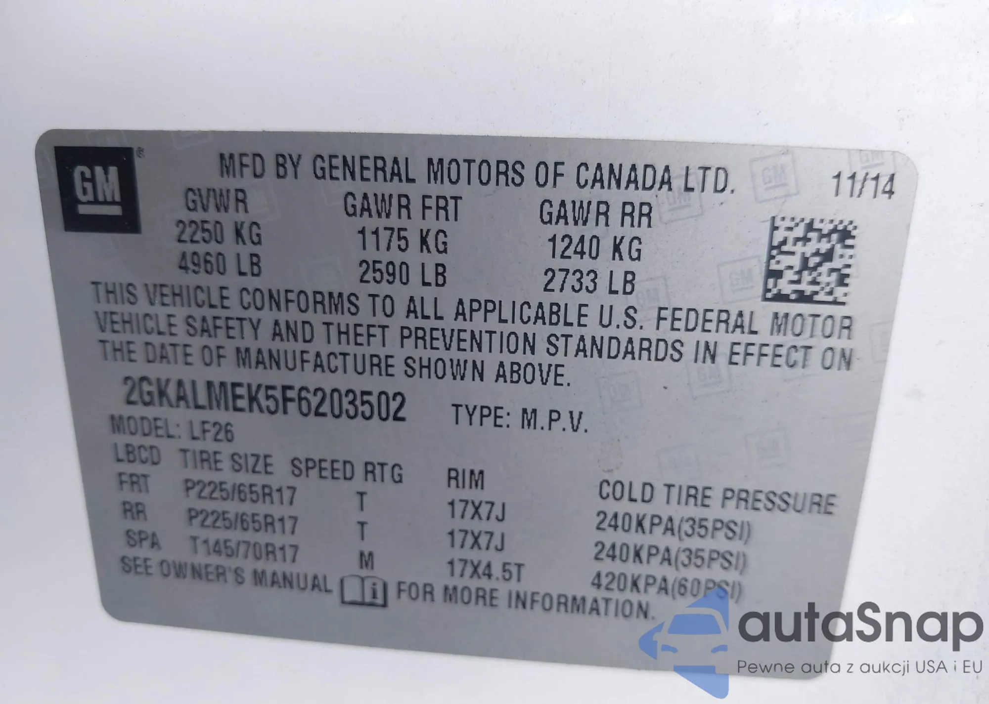 • VIN 2GKALMEK5F6203502