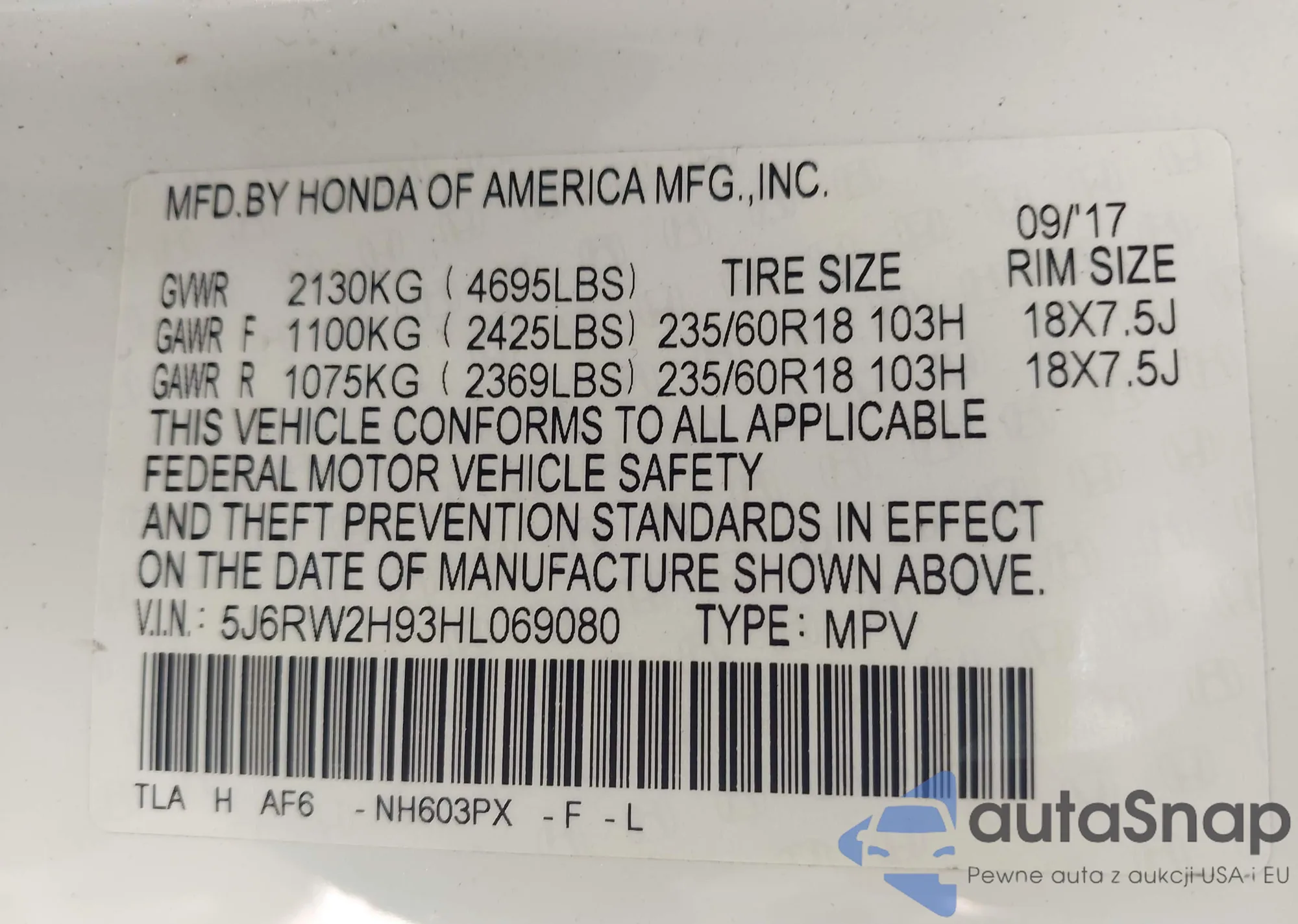 • VIN 5J6RW2H93HL069080