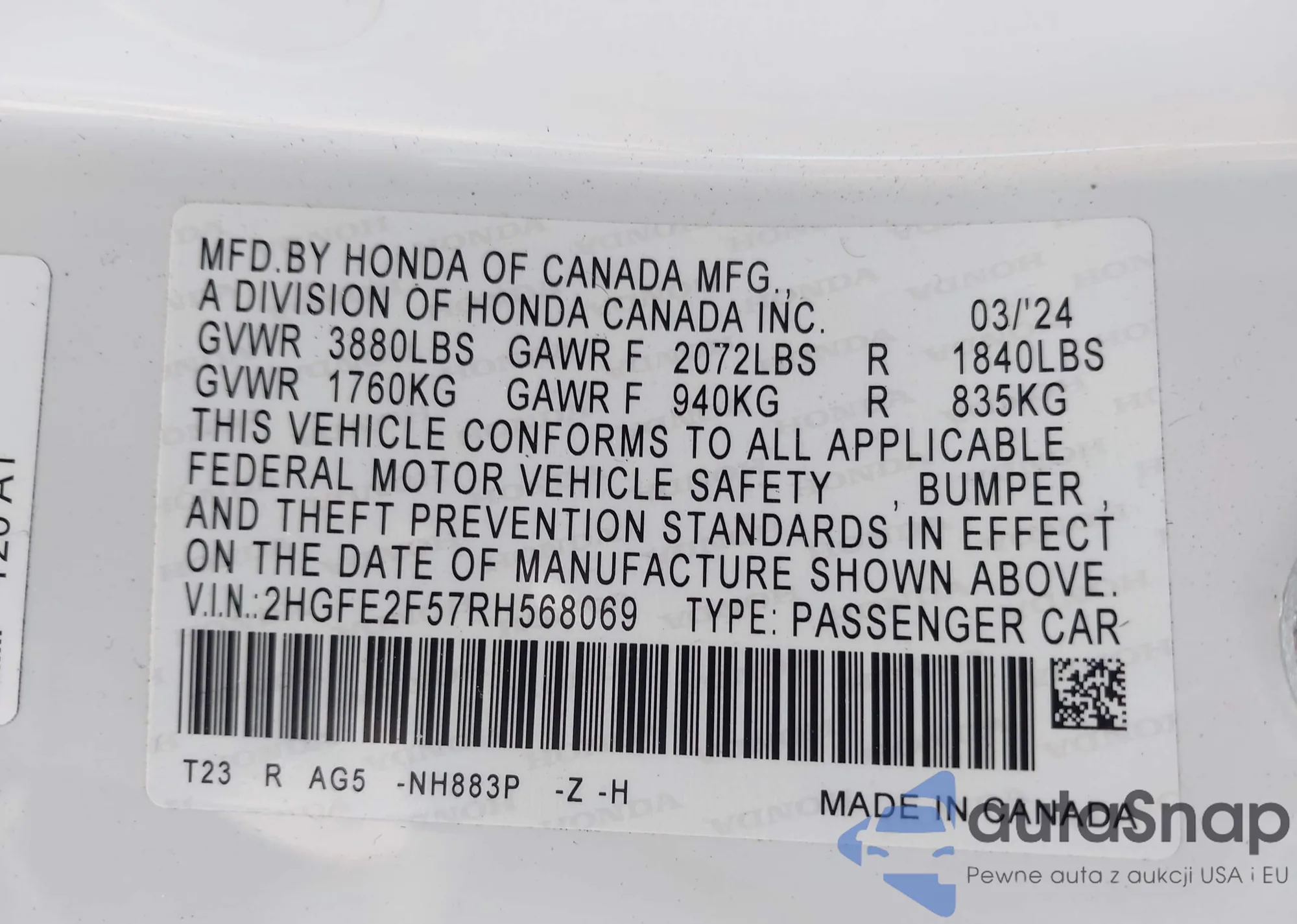 LOT: 43581342 VIN: 2HGFE2F57RH568069