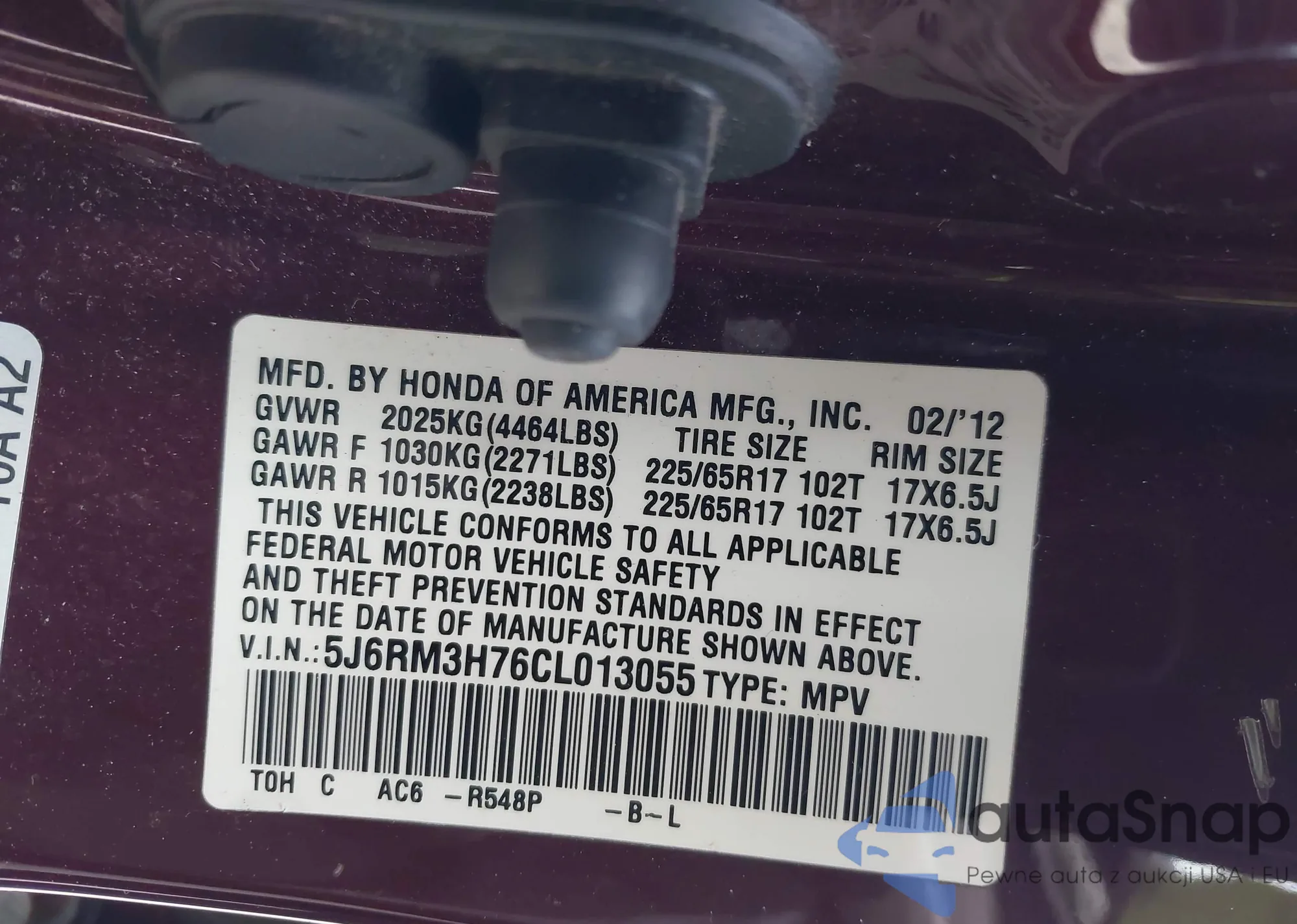 • VIN 5J6RM3H76CL013055