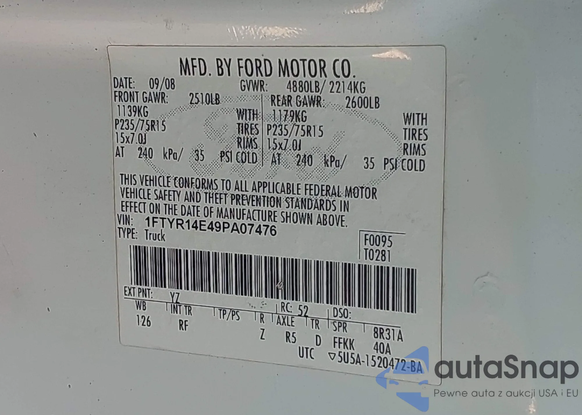 LOT: 43298610 VIN: 1FTYR14E49PA07476