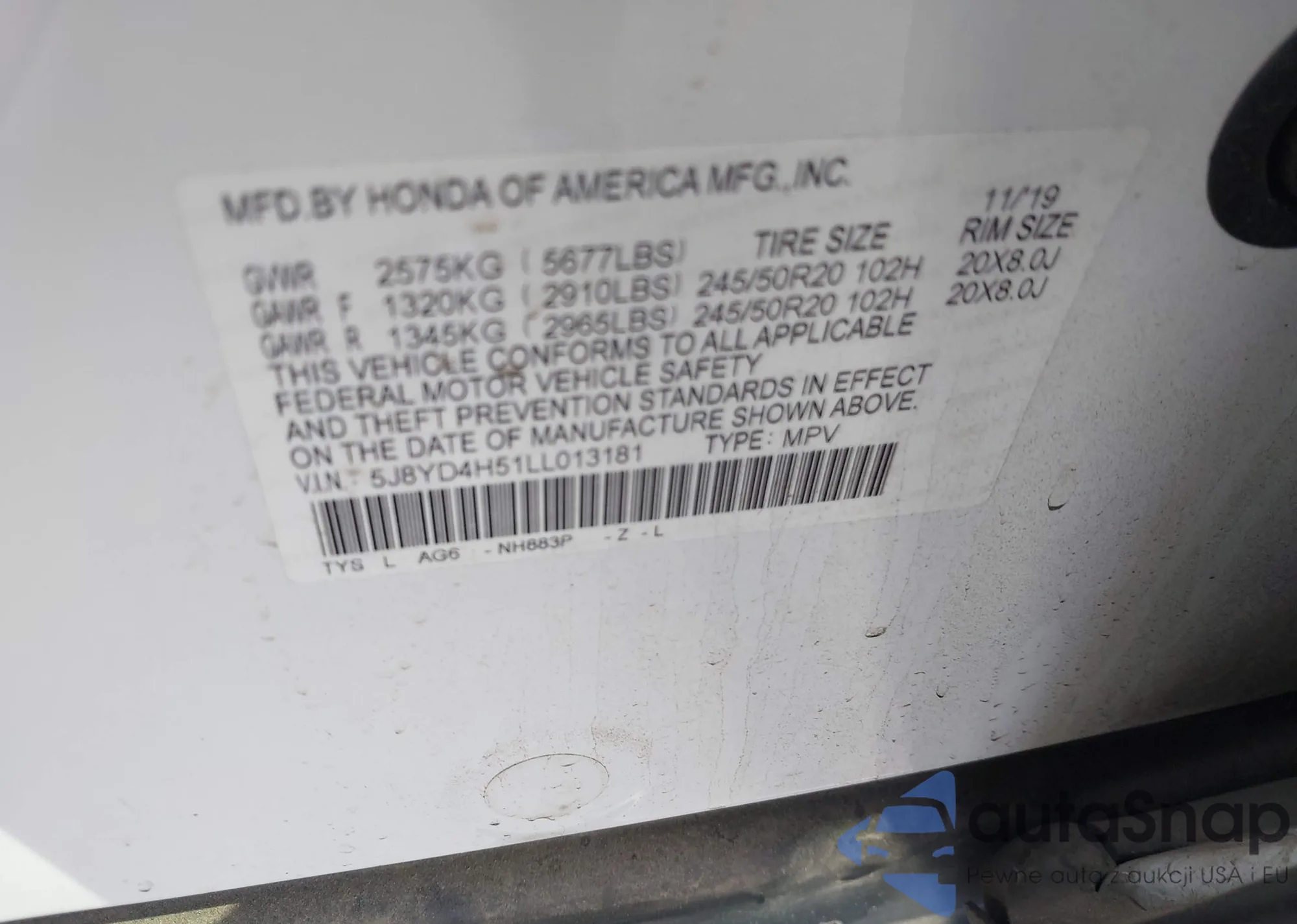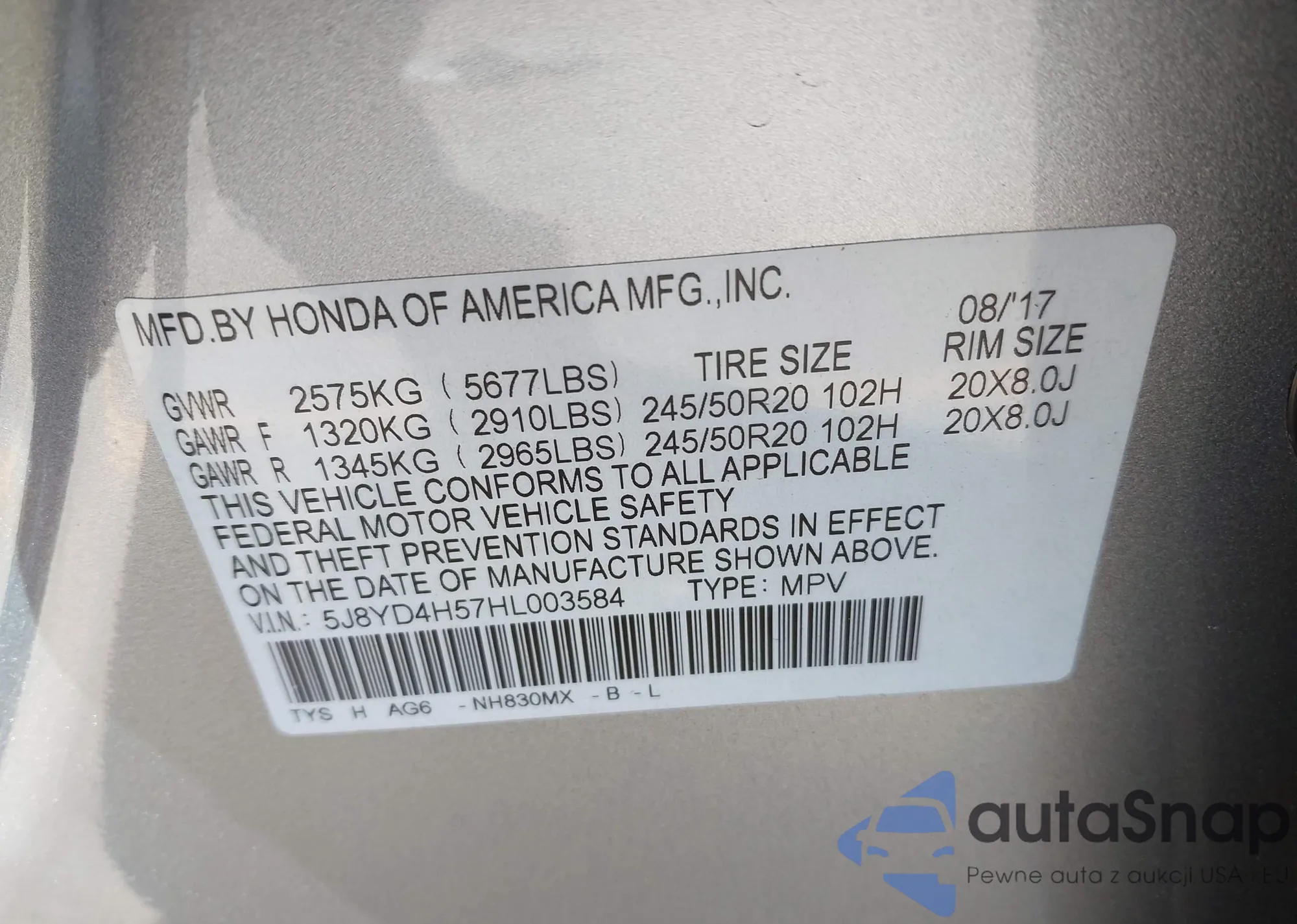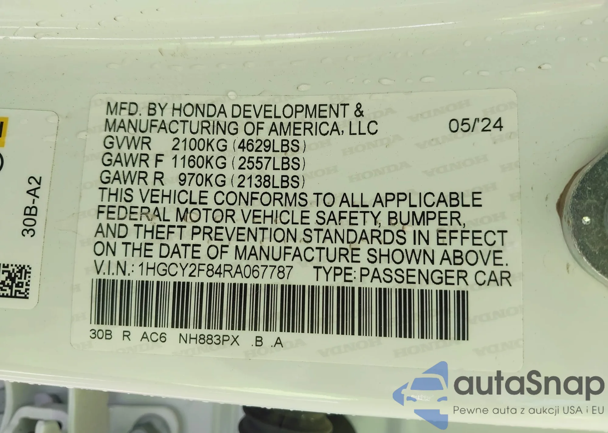 LOT: 43327773 VIN: 1HGCY2F84RA067787