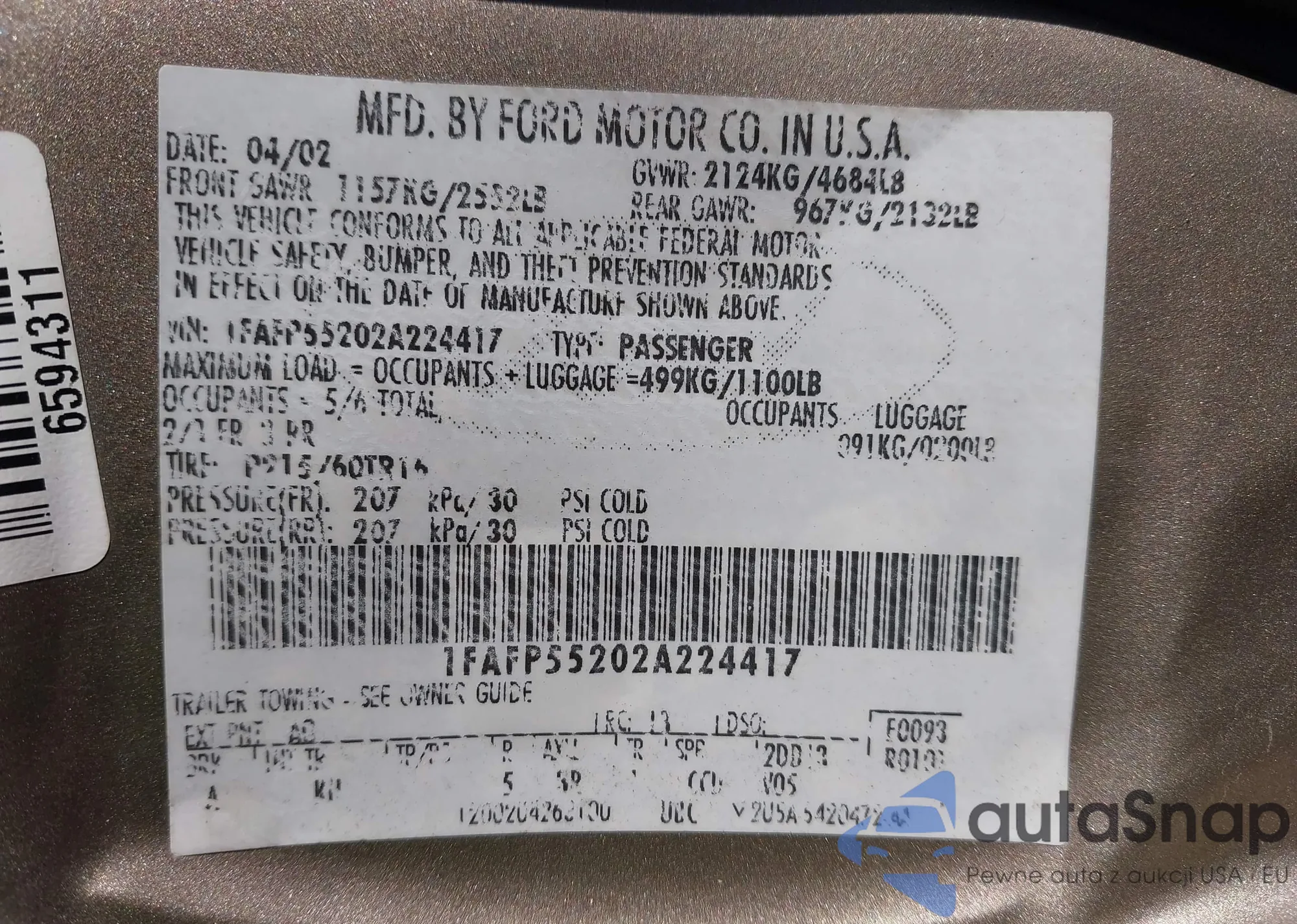 LOT: 43129237 VIN: 1FAFP55202A224417