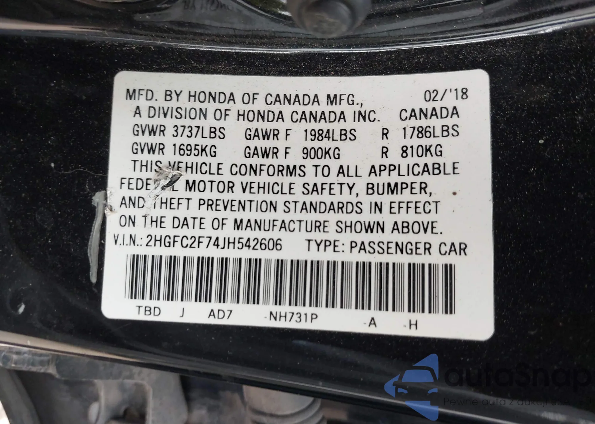 • VIN 2HGFC2F74JH542606