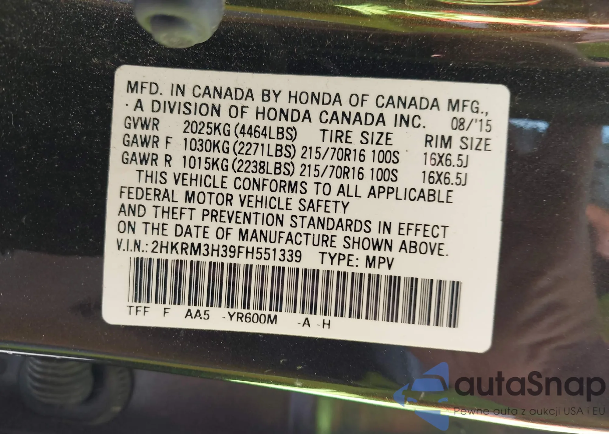 LOT: 43420759 VIN: 2HKRM3H39FH551339