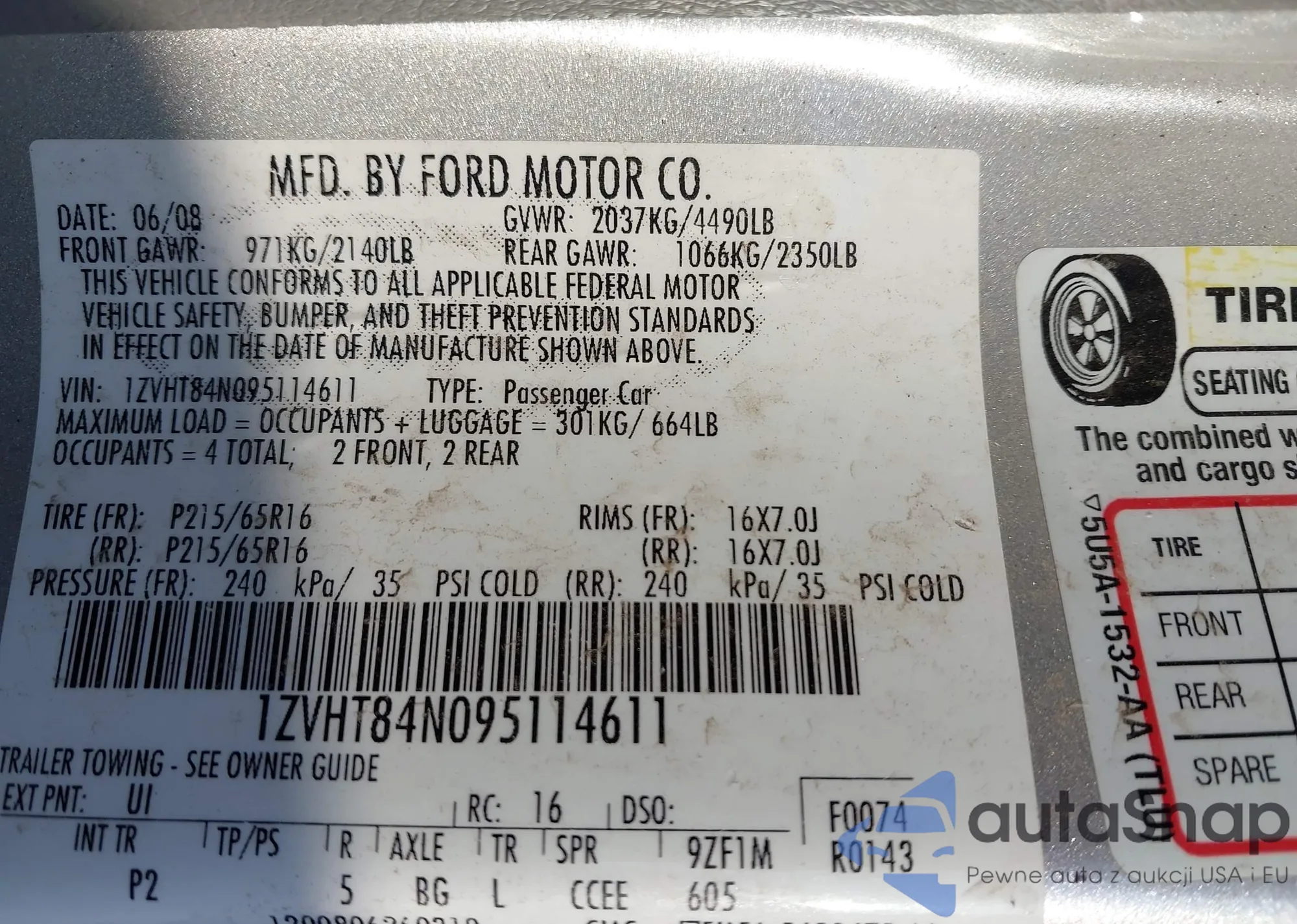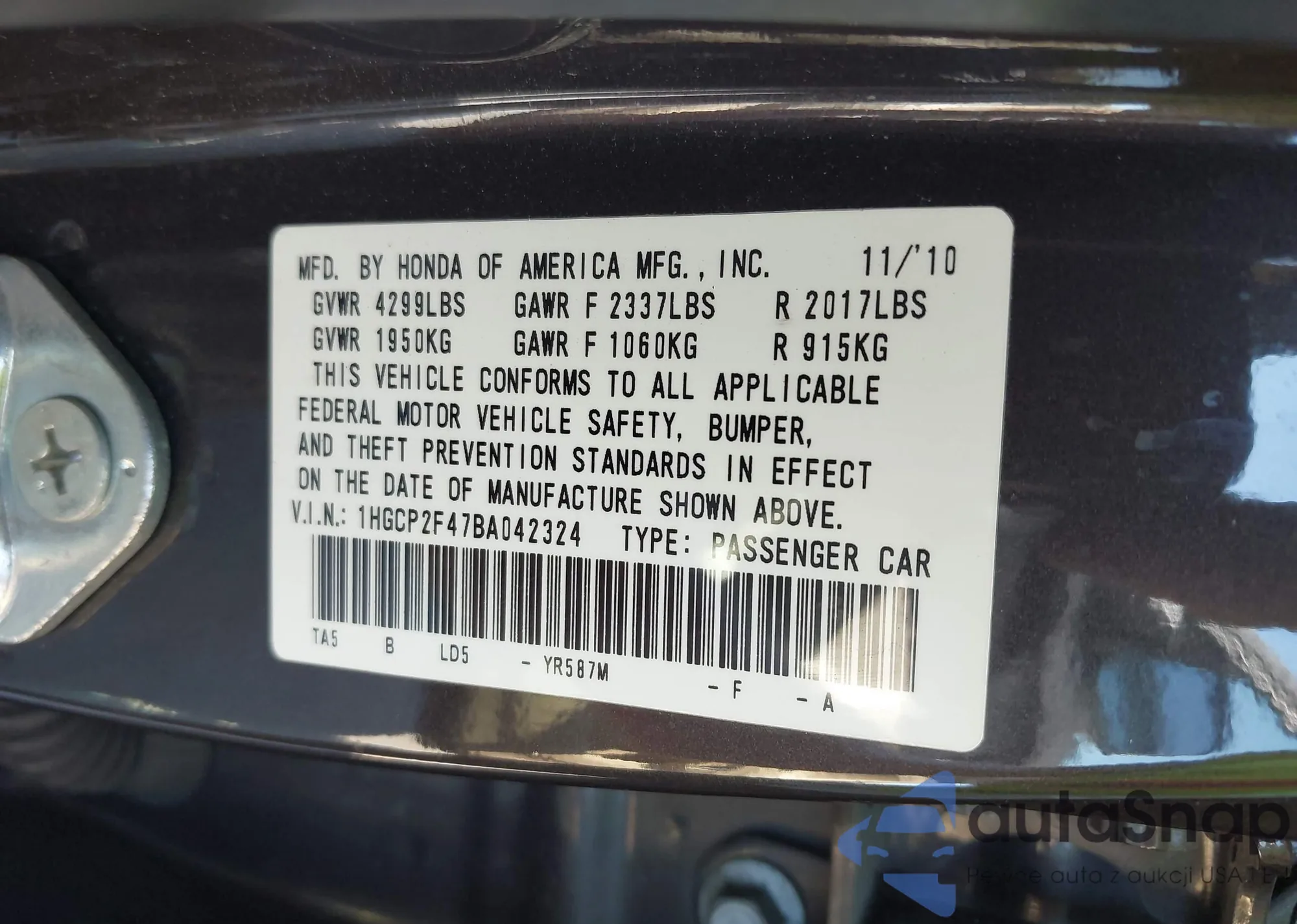 LOT: 43458139 VIN: 1HGCP2F47BA042324