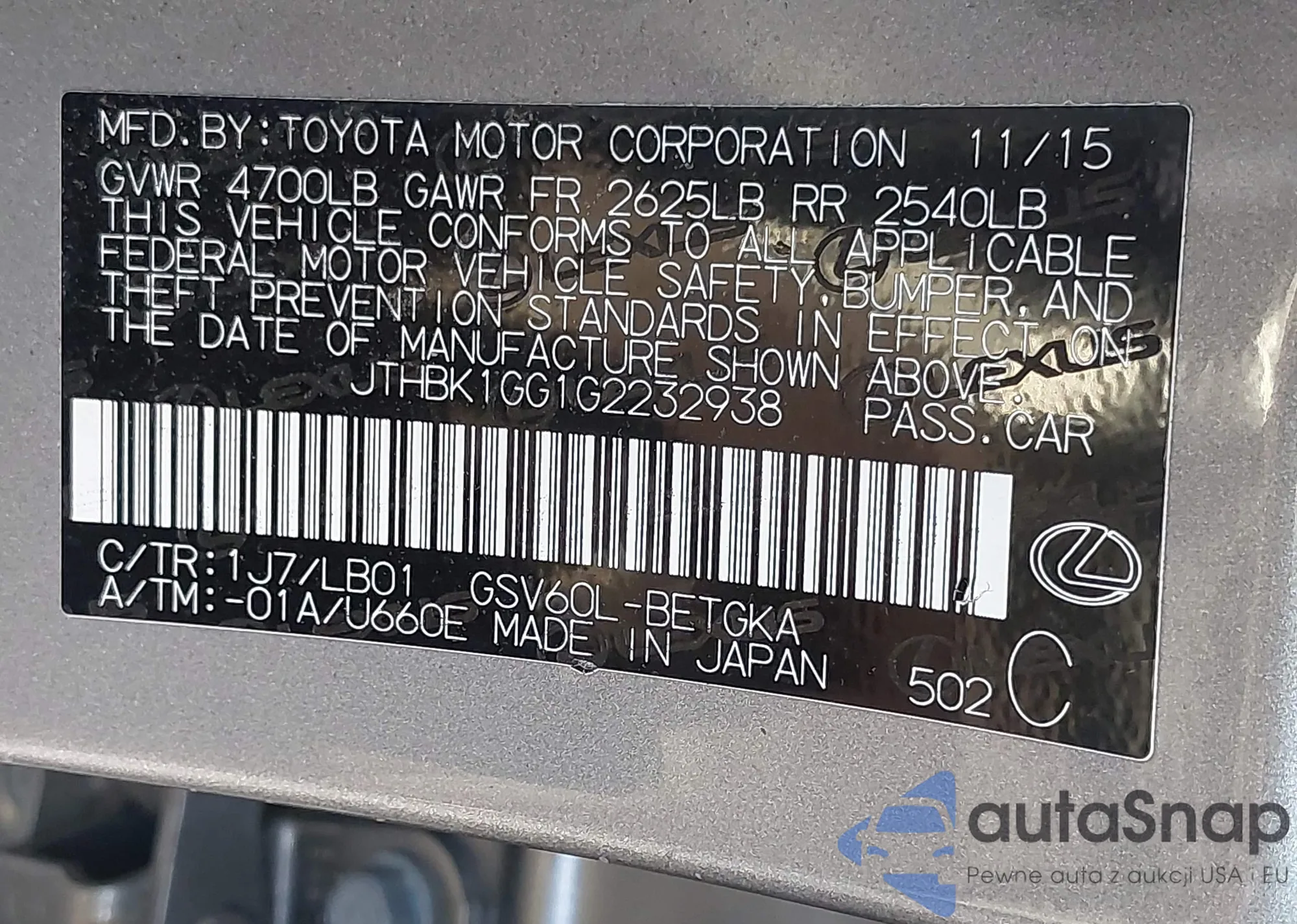 LOT: 43618097 VIN: JTHBK1GG1G2232938