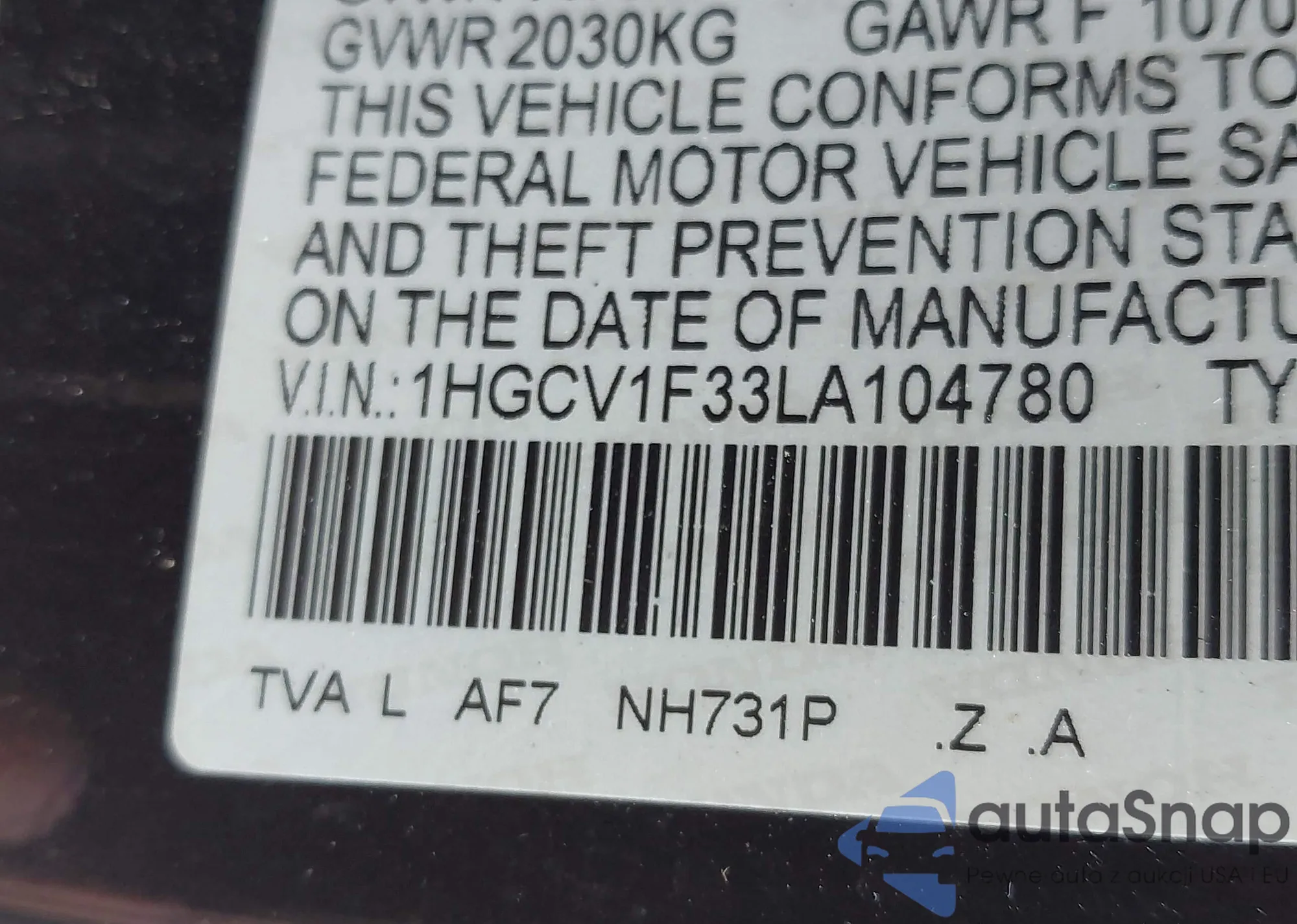 • VIN 1HGCV1F33LA104780