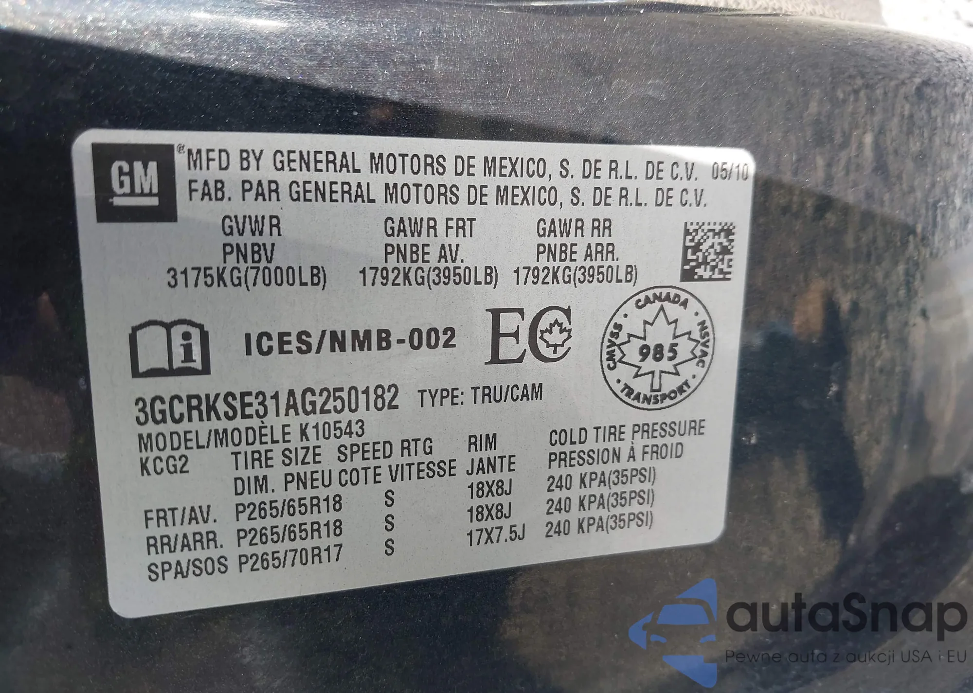 LOT: 43447911 VIN: 3GCRKSE31AG250182
