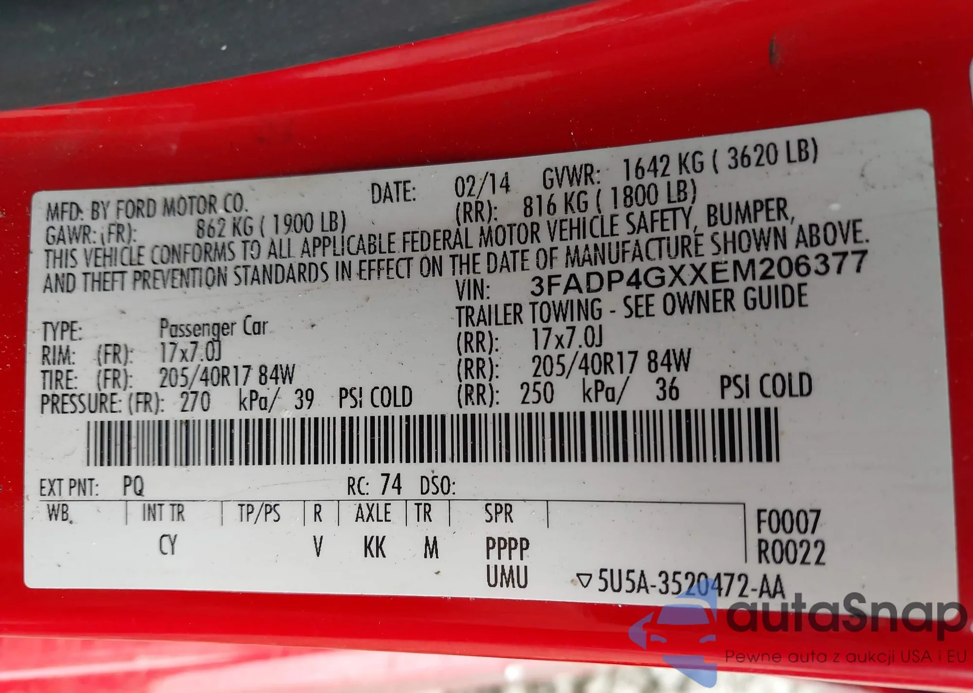 LOT: 43166108 VIN: 3FADP4GXXEM206377