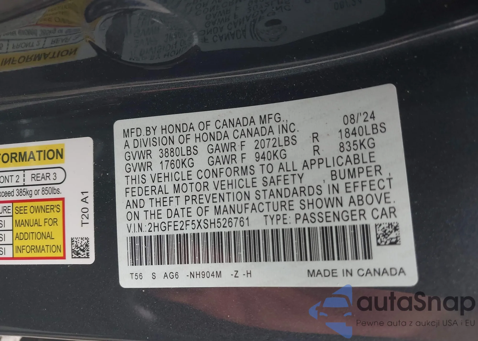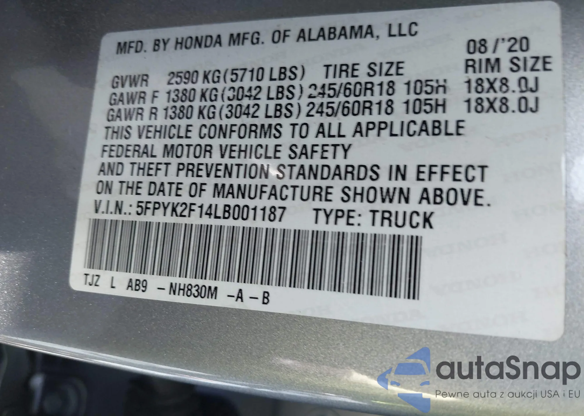 • VIN 5FPYK2F14LB001187