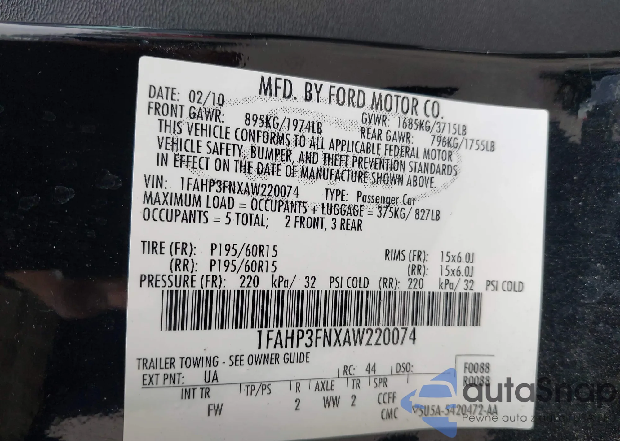 • VIN 1FAHP3FNXAW220074