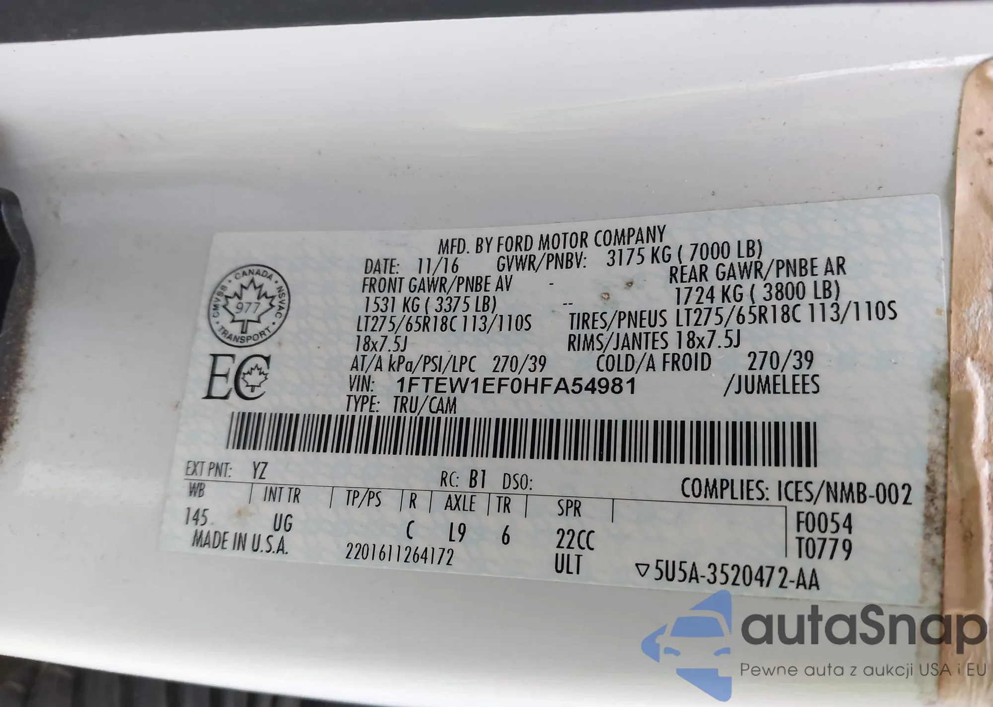 LOT: 43712935 VIN: 1FTEW1EF0HFA54981
