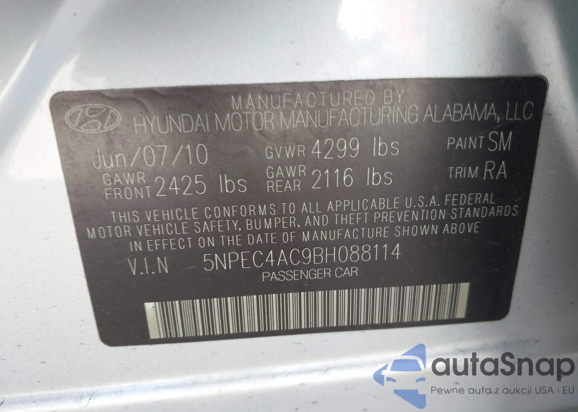 • VIN 5NPEC4AC9BH088114