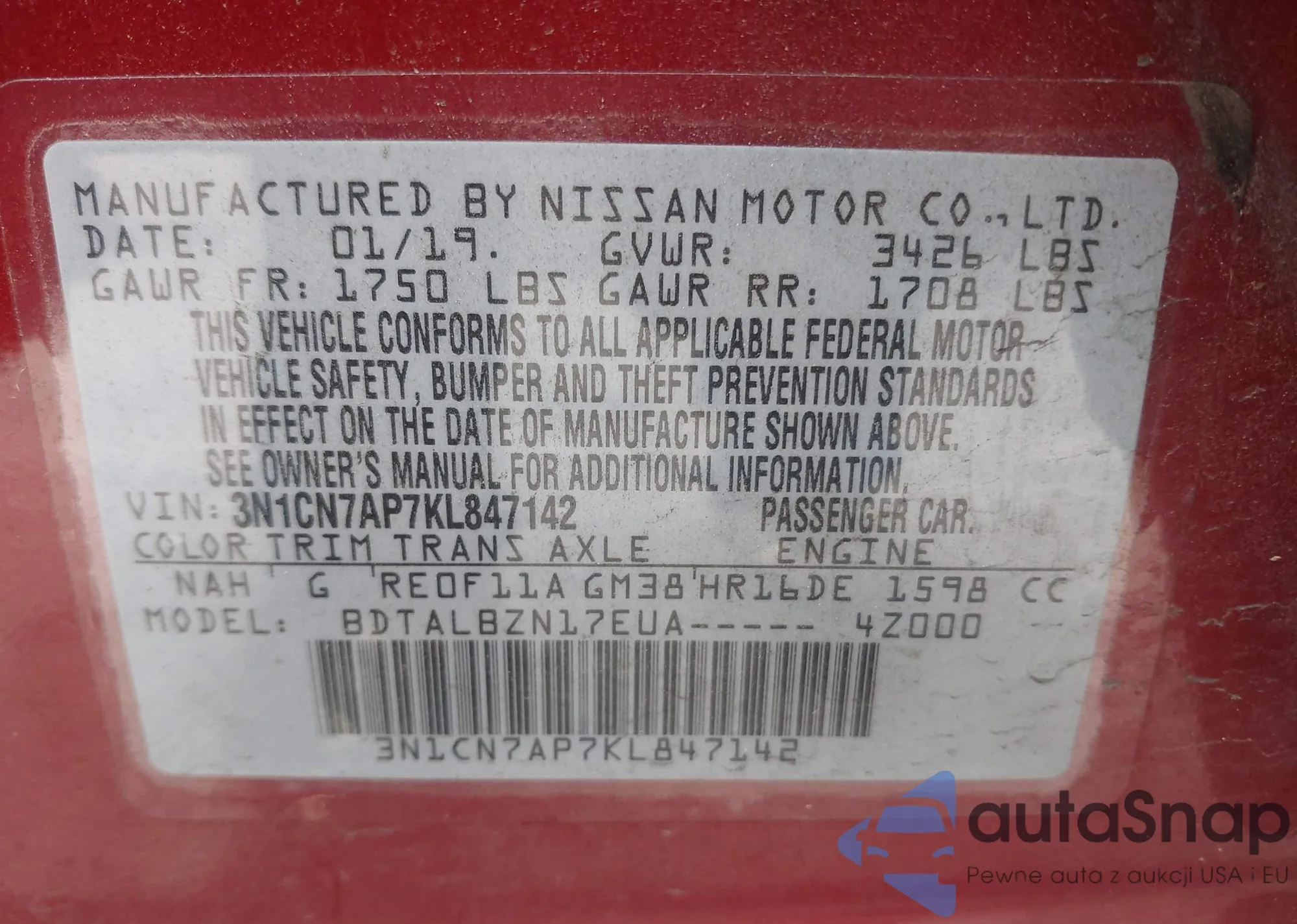 • VIN 5J6RW1H52KA039207
