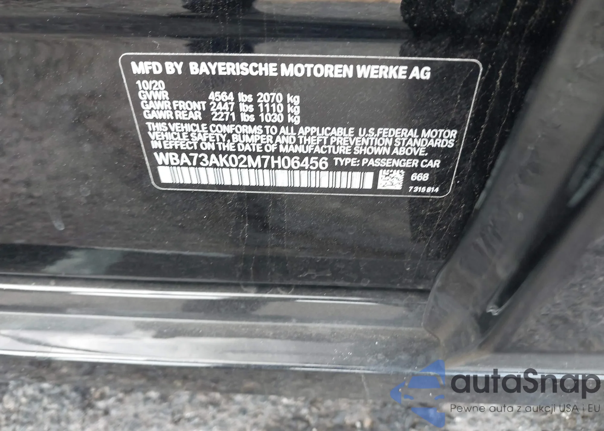 • VIN WBA73AK02M7H06456