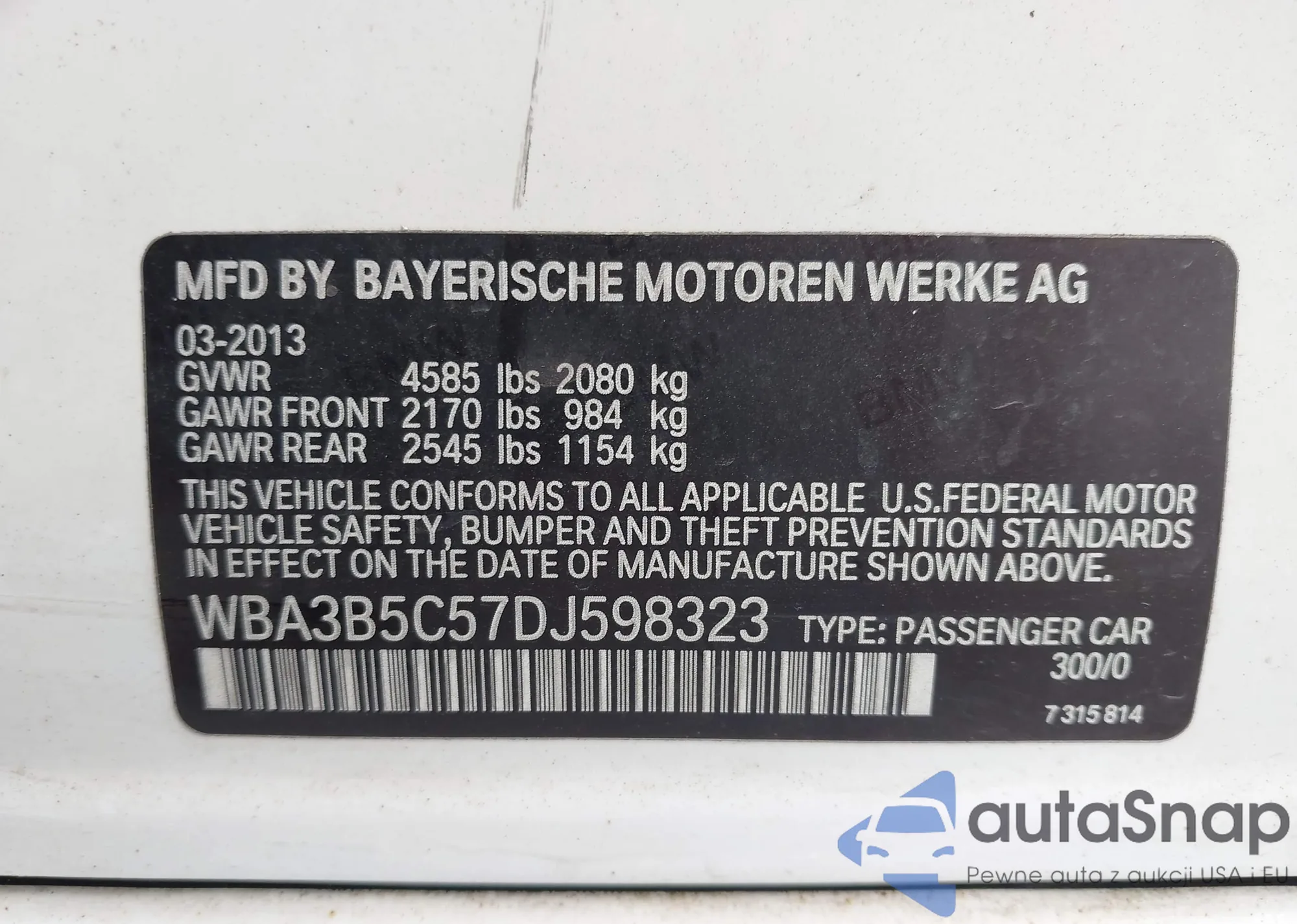 LOT: 43430203 VIN: WBA73AK02M7H06456