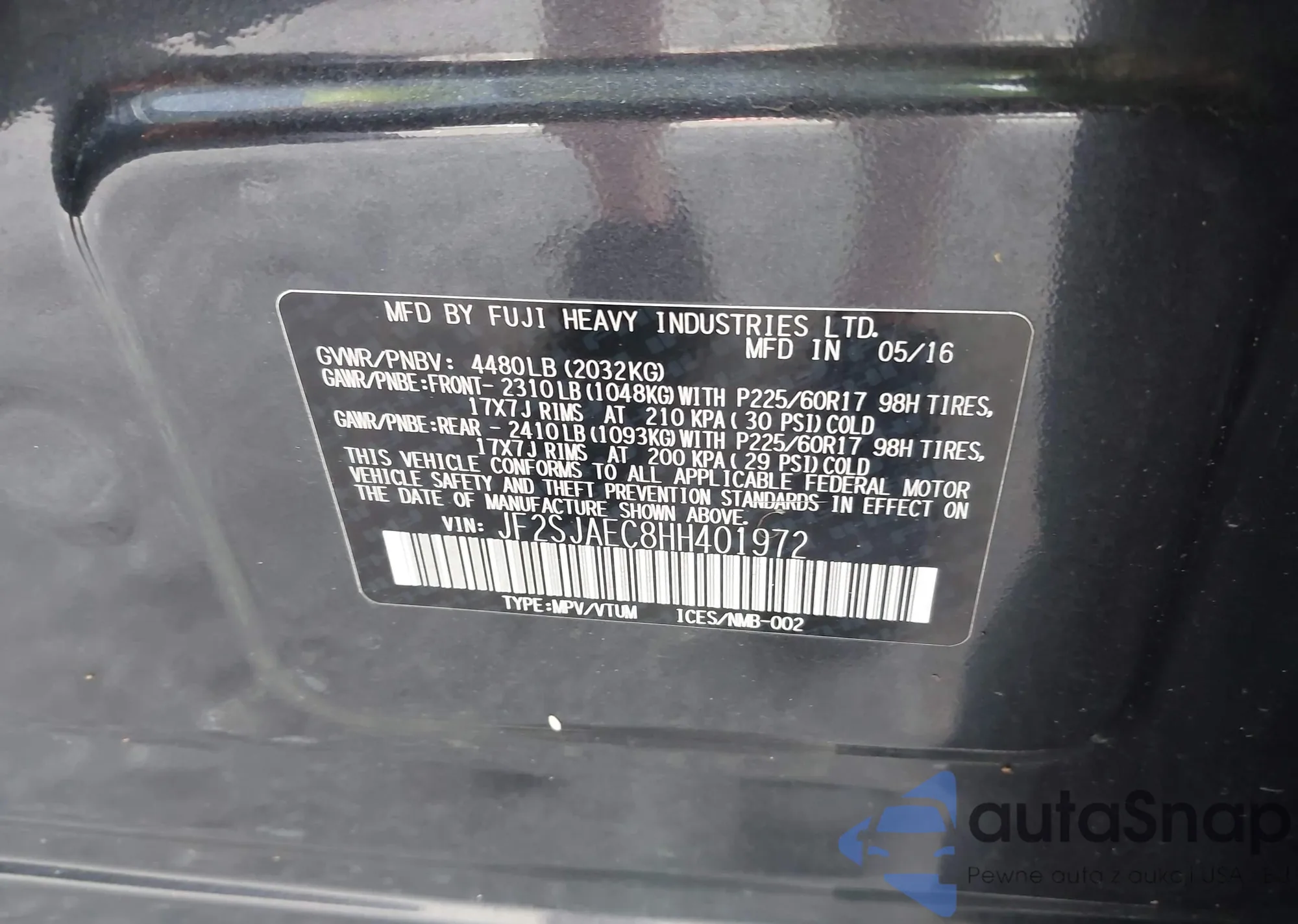 • VIN JF2SJAEC8HH401972