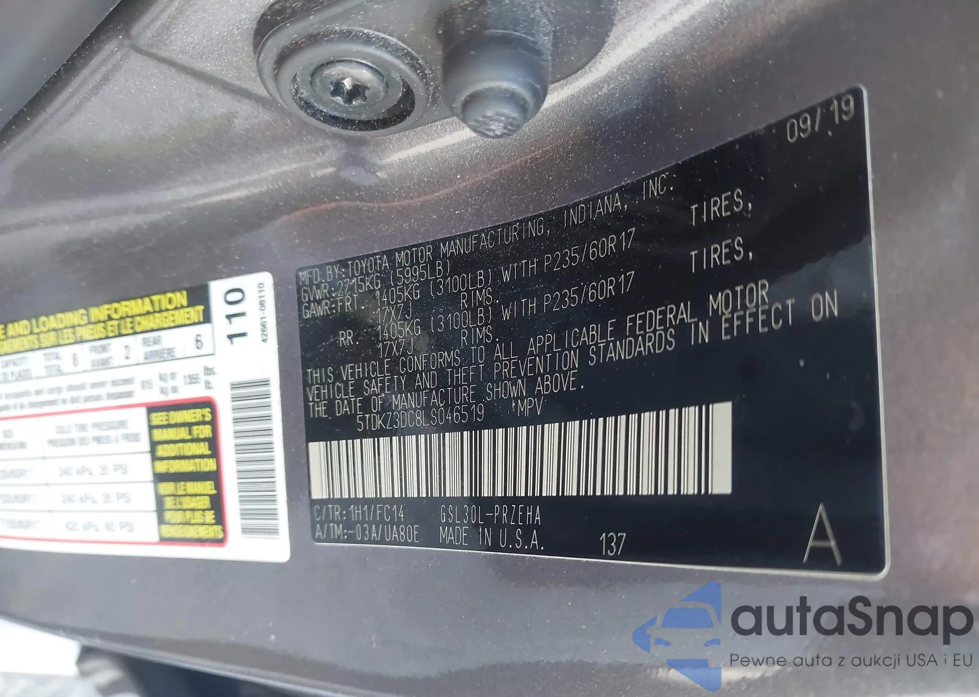 LOT: 43781897 VIN: 5TDKZ3DC8LS046519