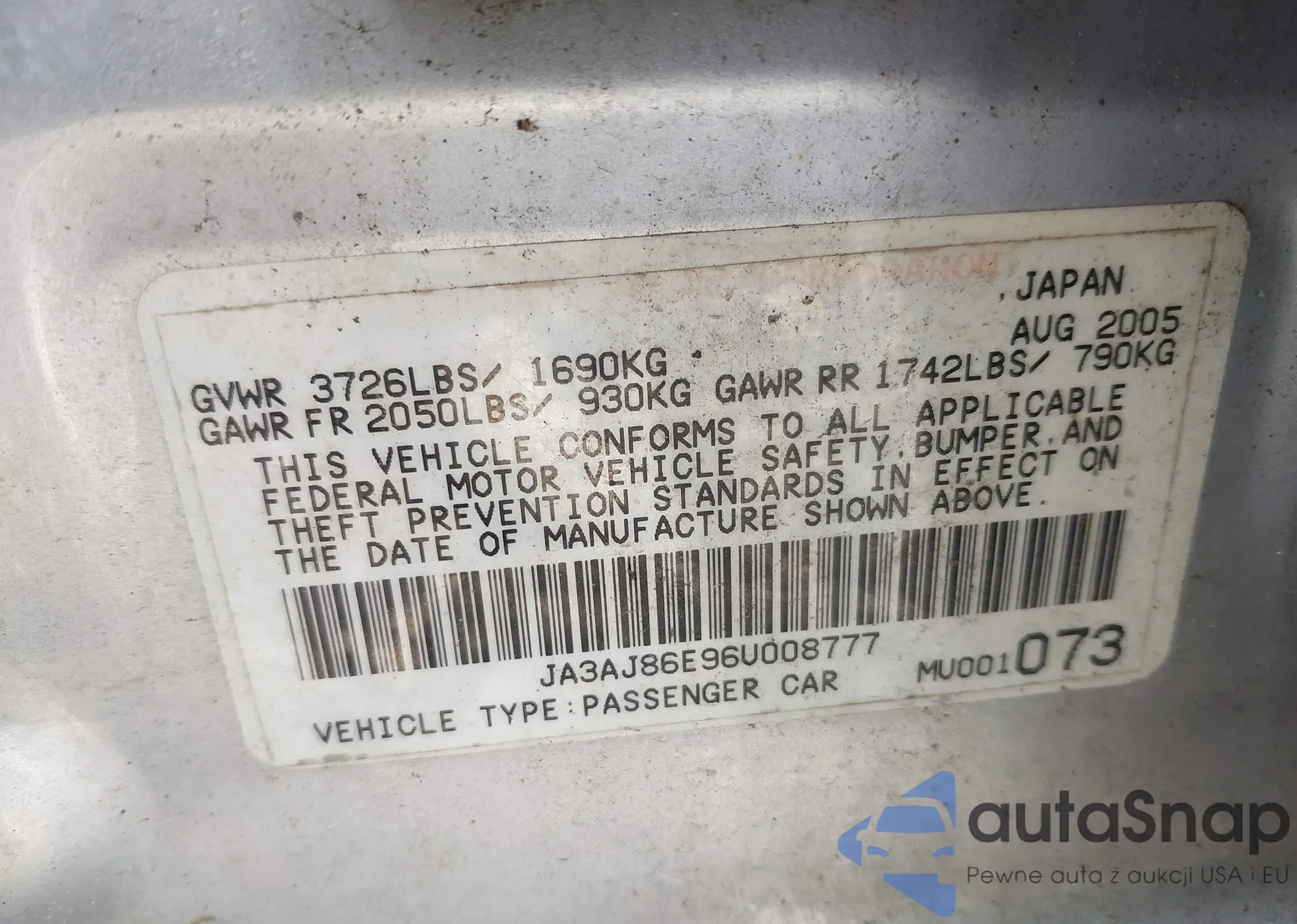 LOT: 43306018 VIN: JA3AJ86E96U008777