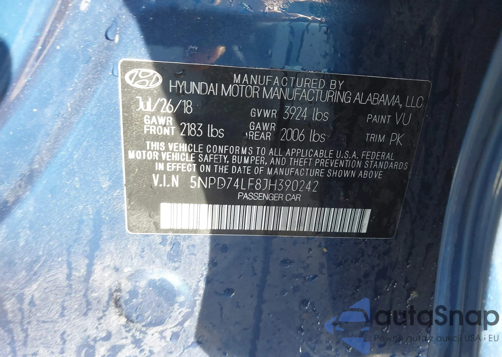 LOT: 43465205 VIN: 5NPD74LF8JH390242