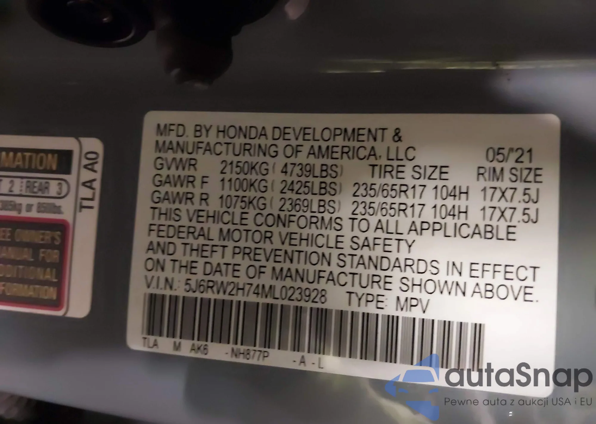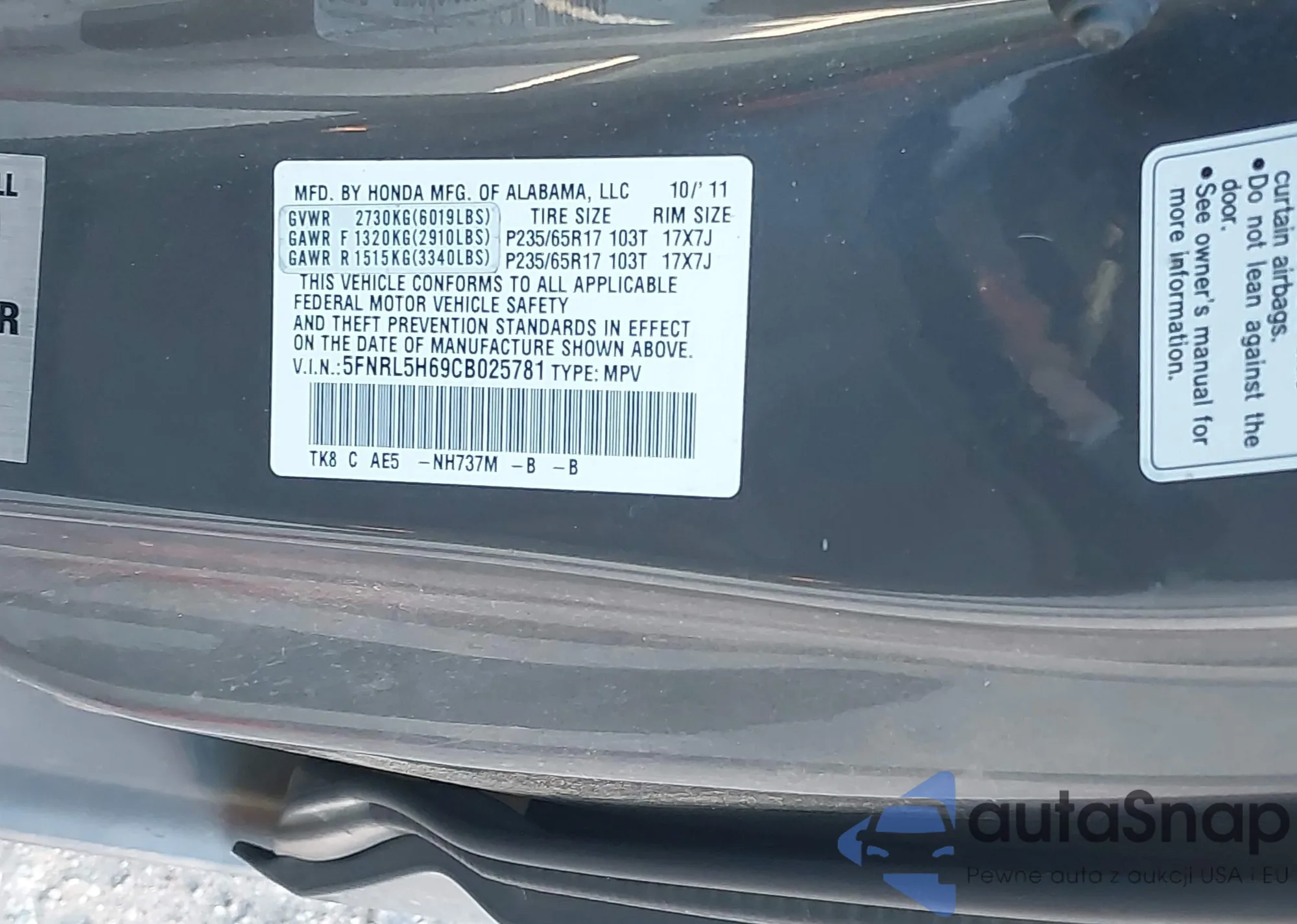 • VIN 5FNRL5H69CB025781