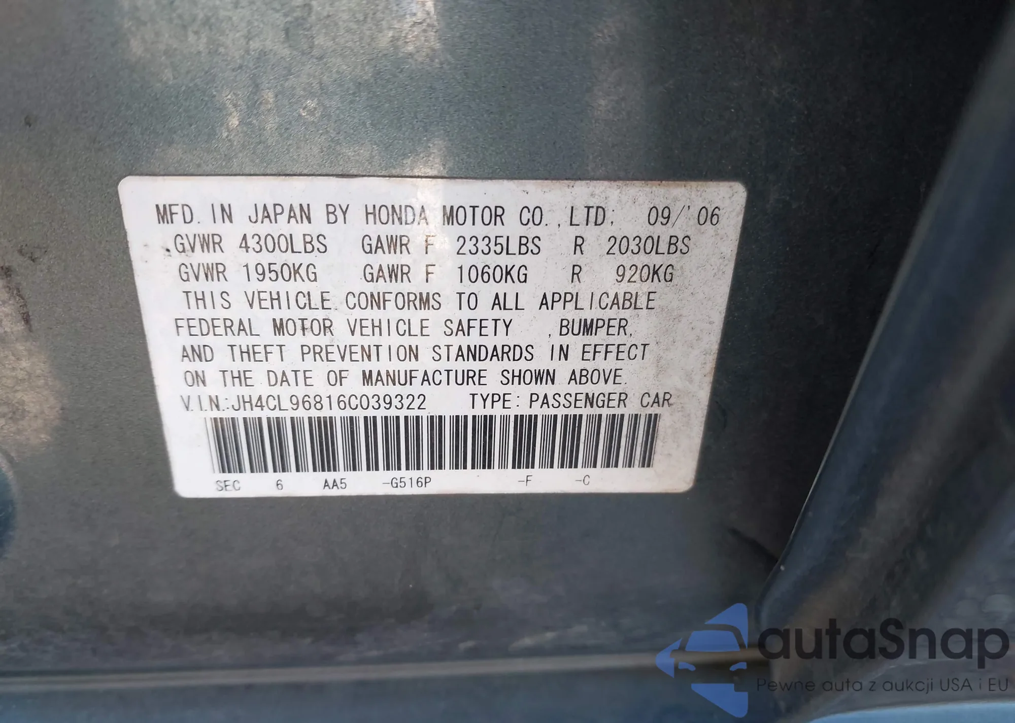 LOT: 43408601 VIN: JH4CL96816C039322