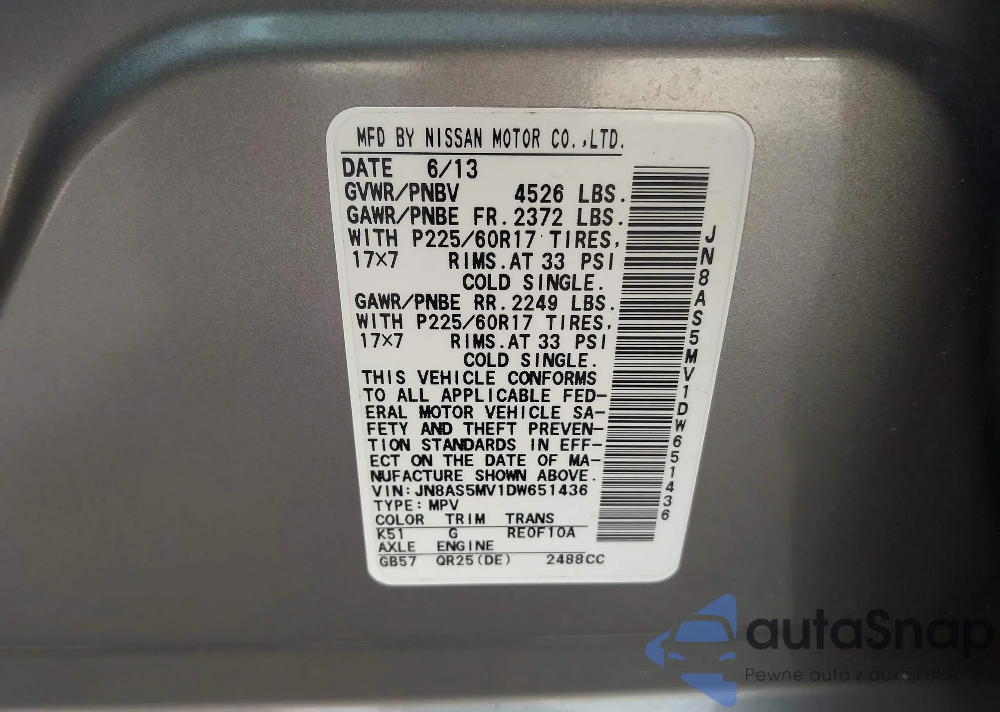 LOT: 43511467 VIN: JN8AS5MV1DW651436
