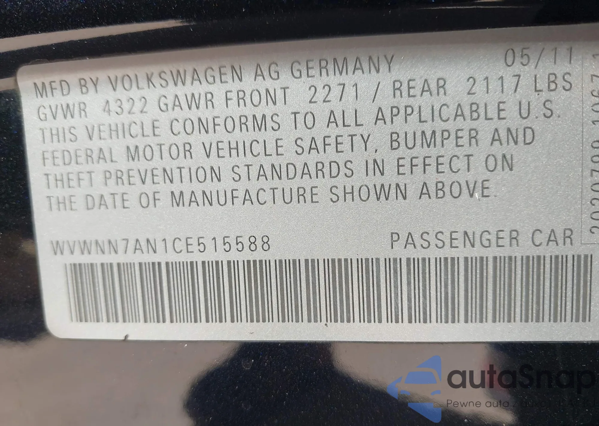 LOT: 43556817 VIN: WVWNN7AN1CE515588