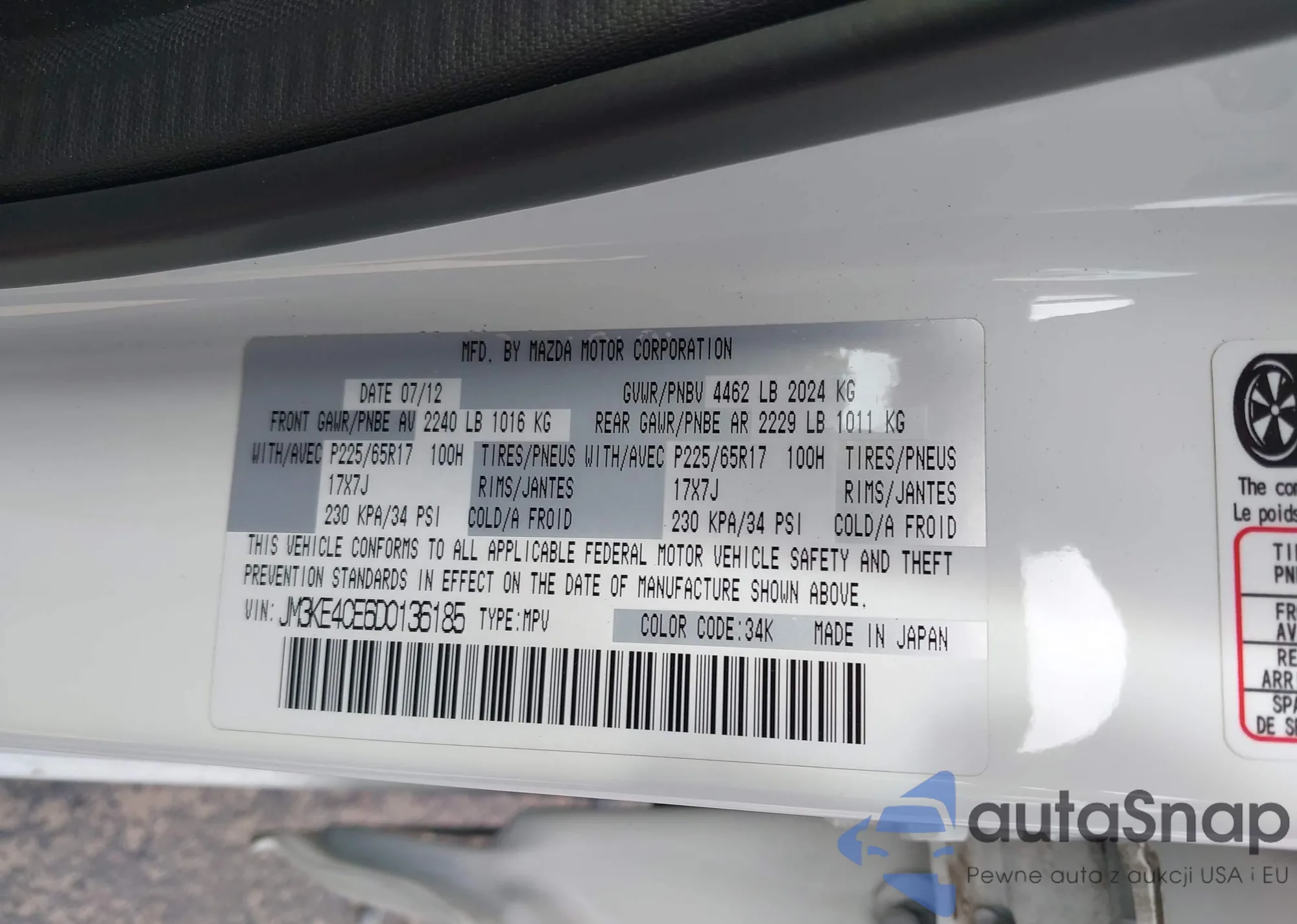 LOT: 43697438 VIN: JM3KE4CE6D0136185