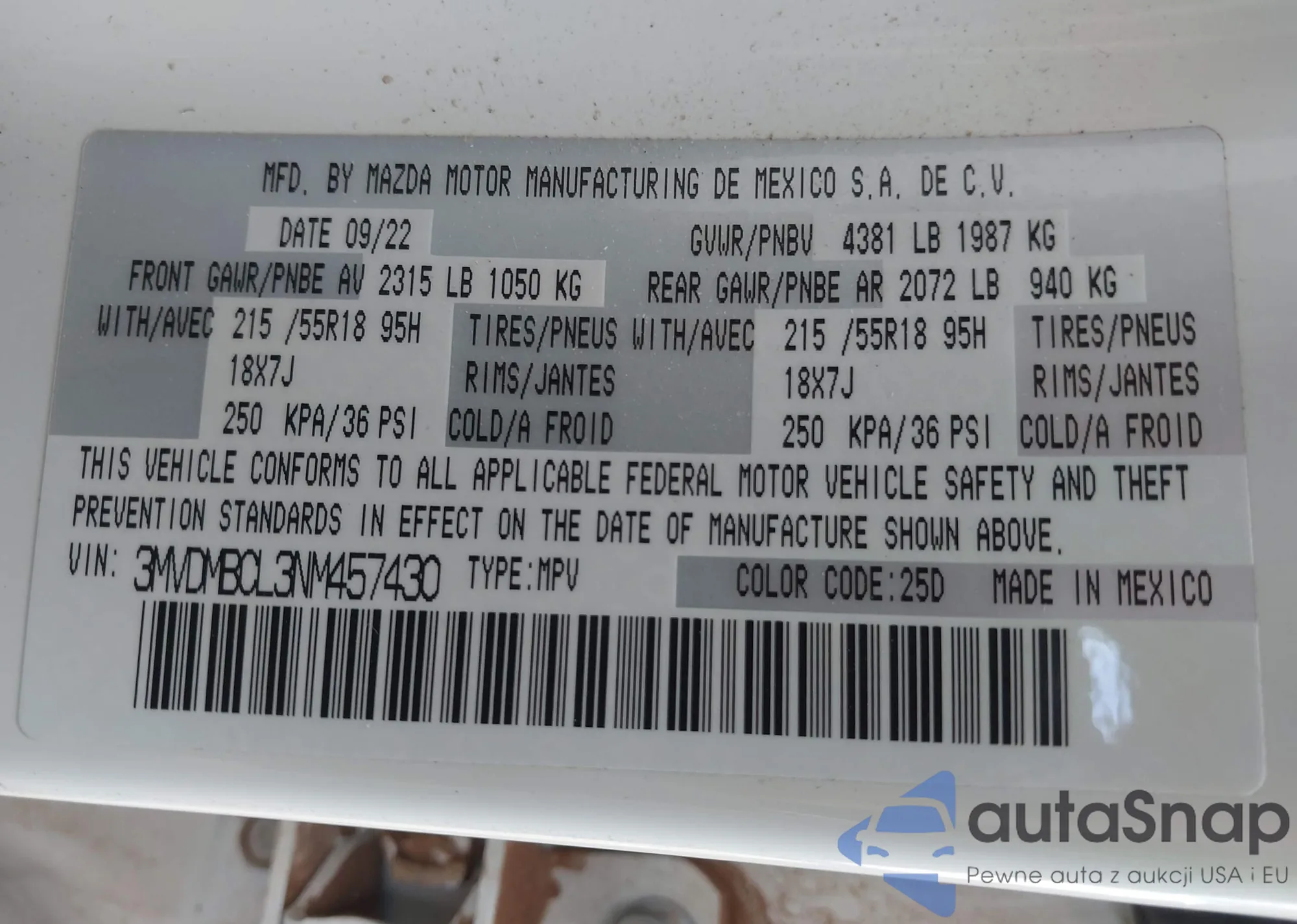 • VIN 3MVDMBCL3NM457430
